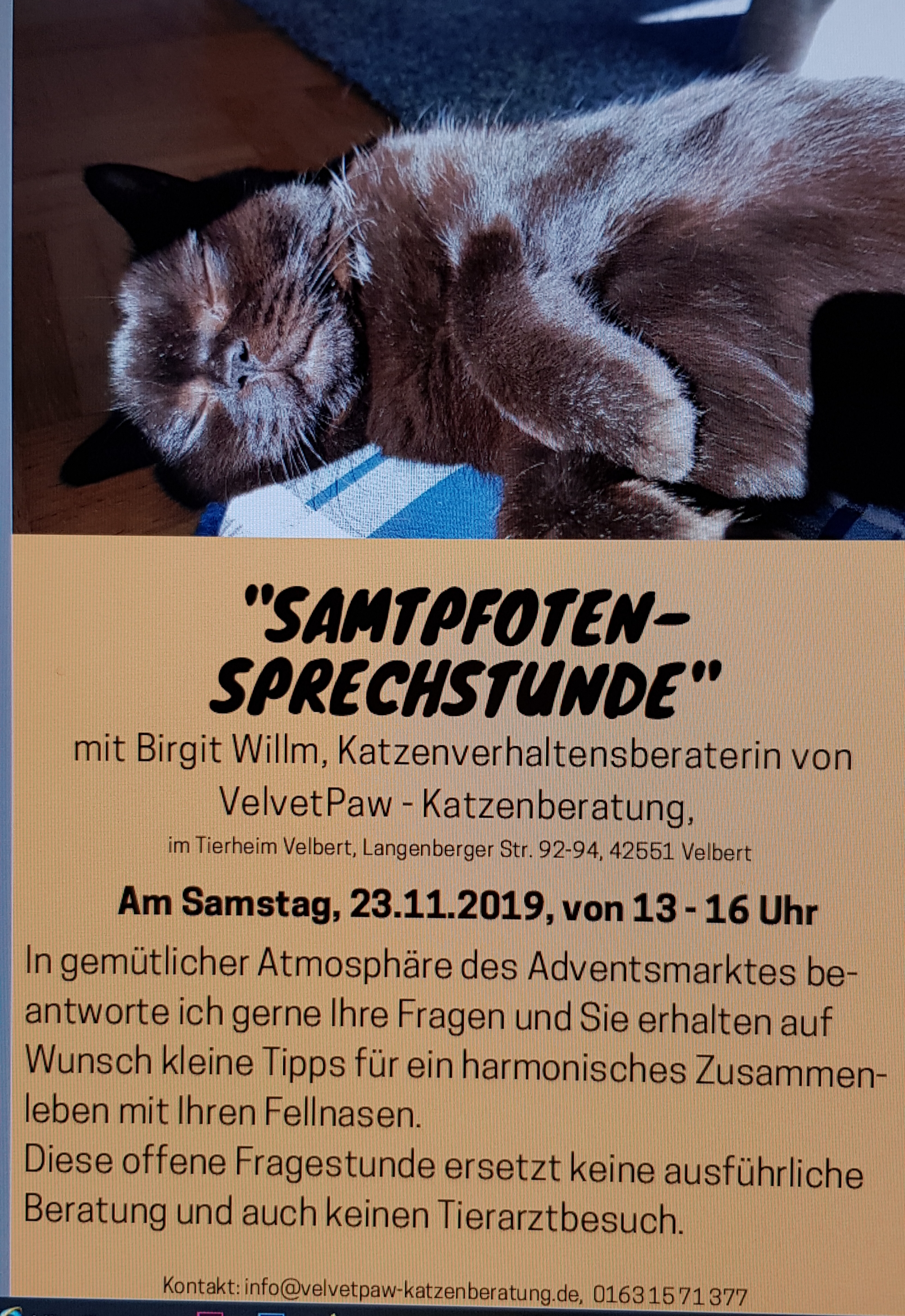 0 Wir laden Sie herzlich zum Adventsmarkt ein. Am 23.11.19 von 12 – 17 Uhr im Tierheim Velbert. Tolle Weihnachtsdeko und vieles mehr…… Wir freuen uns auf einen schönen Nachmittag…….