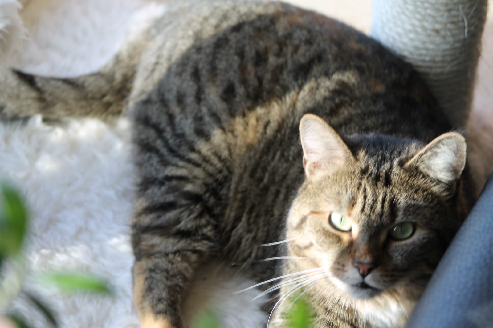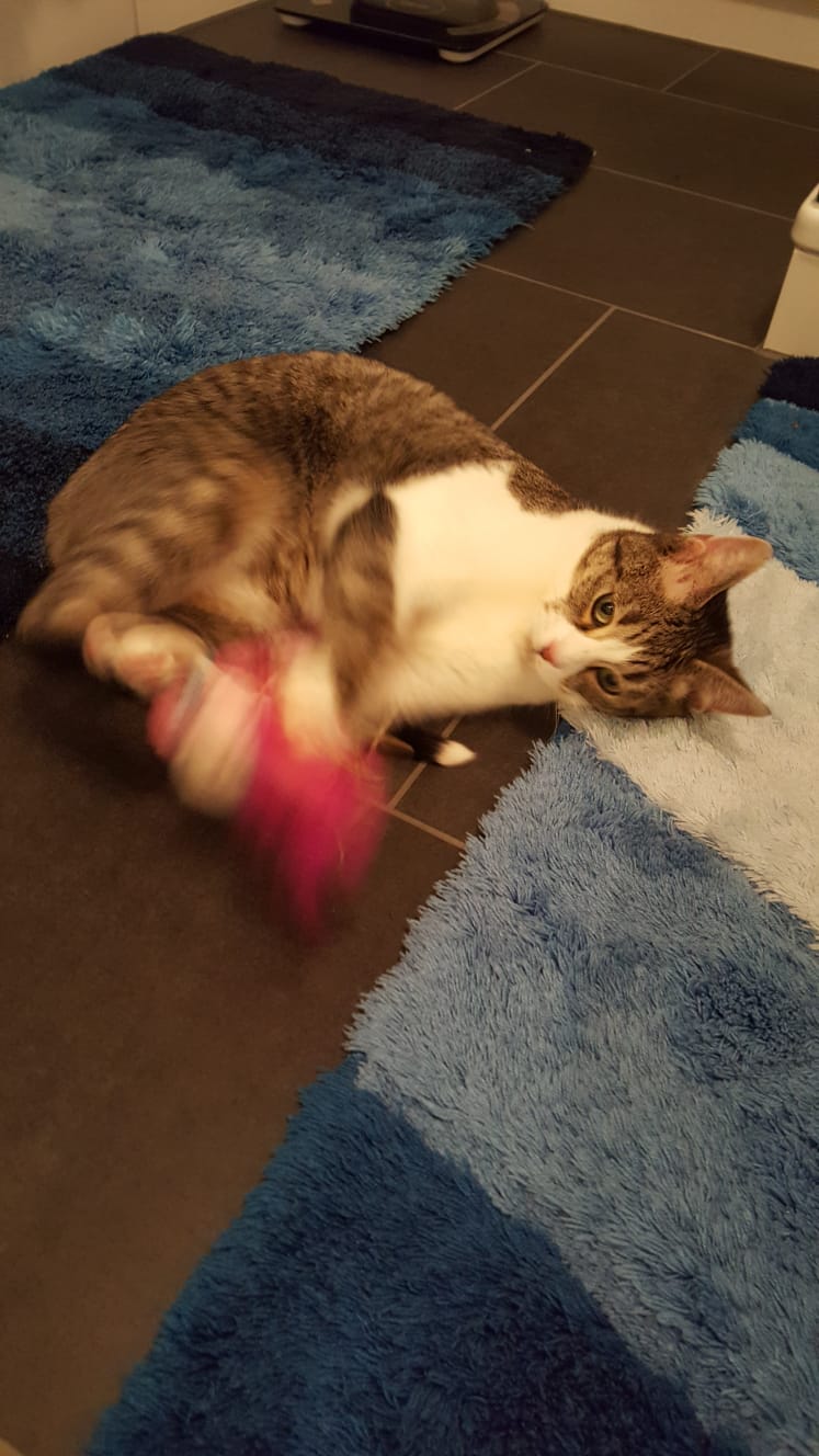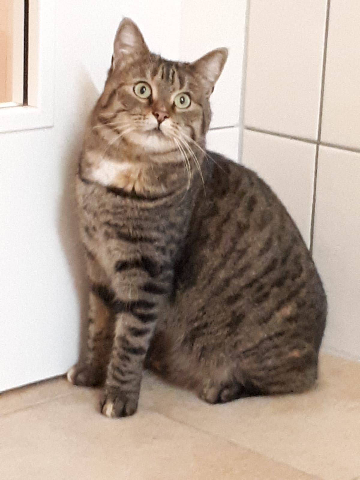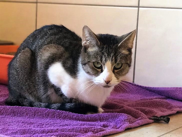 Inga, eine ganz liebenswerte graugetigerte Kuschelmaus, die in unserem Tierheim im Sommer 2017 zur Welt kam, sich unglaublich gerne behutsam den Bauch kraulen lässt und die ebenfalls an Ataxie leidet.