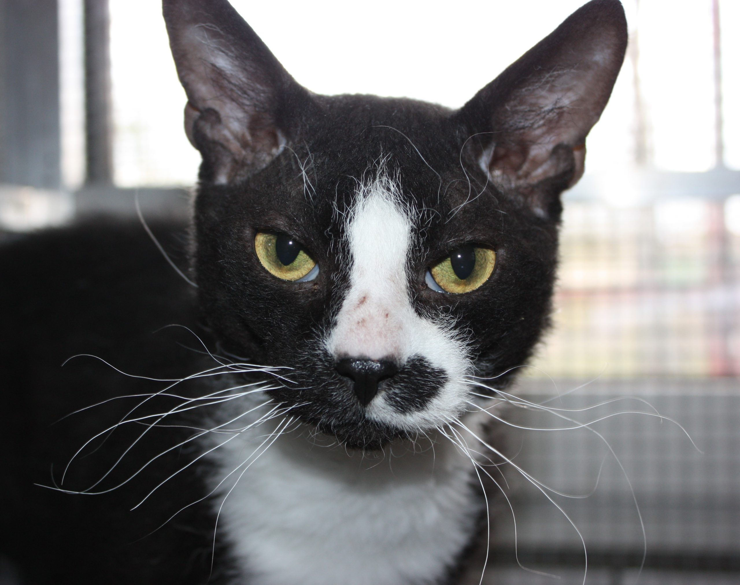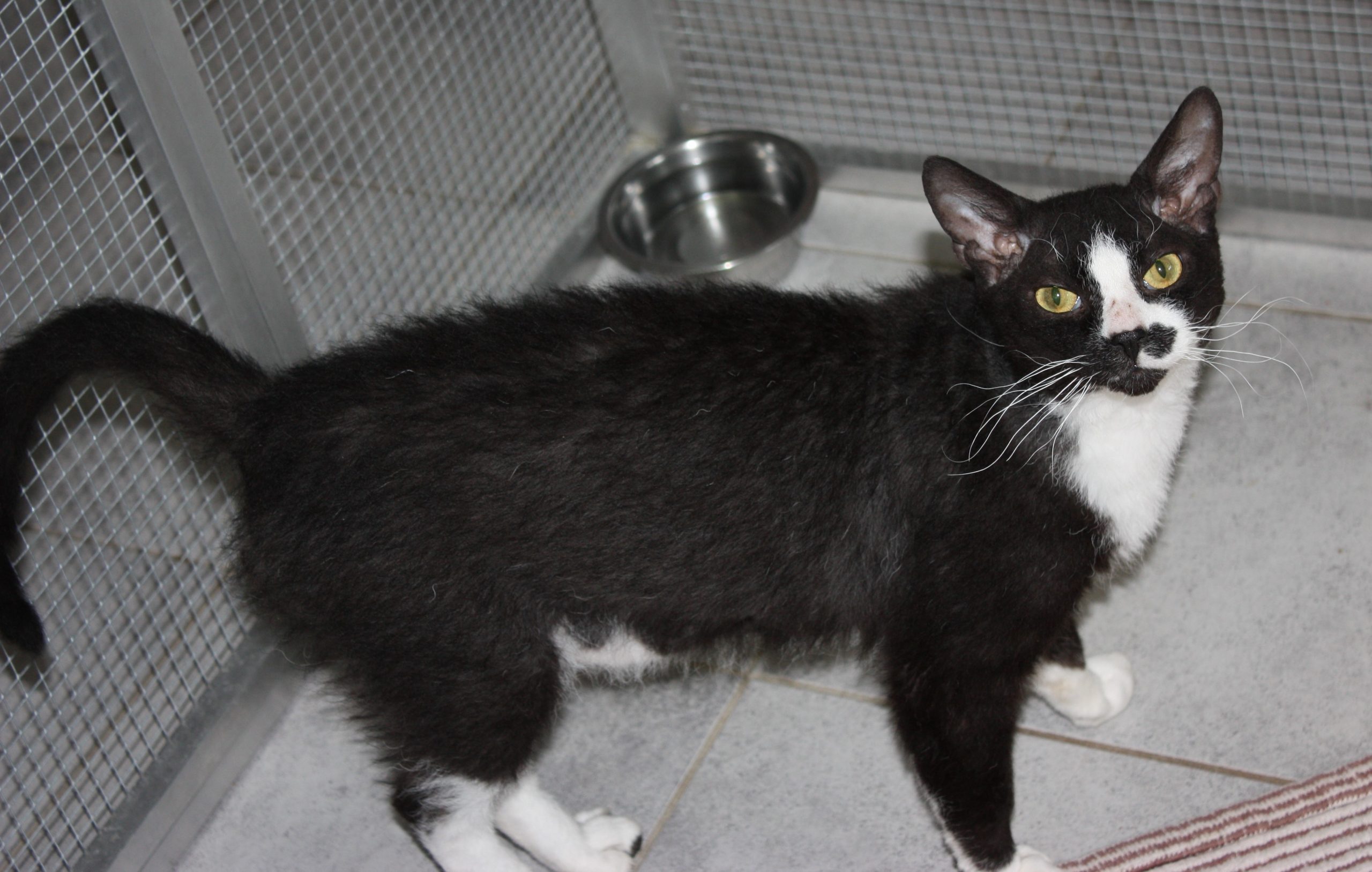 Im März dieses Jahres wurde der Kater von der Rasse der Devon-Rex draußen gefunden und zu uns ins Tierheim gebracht. Hier miaute sich der schwarz-weiße Kater ganz schnell in die Herzen aller Mitarbeiter und Ehrenamtler, aber rasch war klar, dass eine Vermittlung – trotz seiner adeligen Herkunft – nicht einfach sein würde.