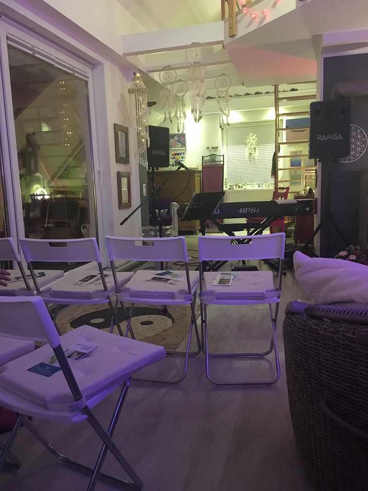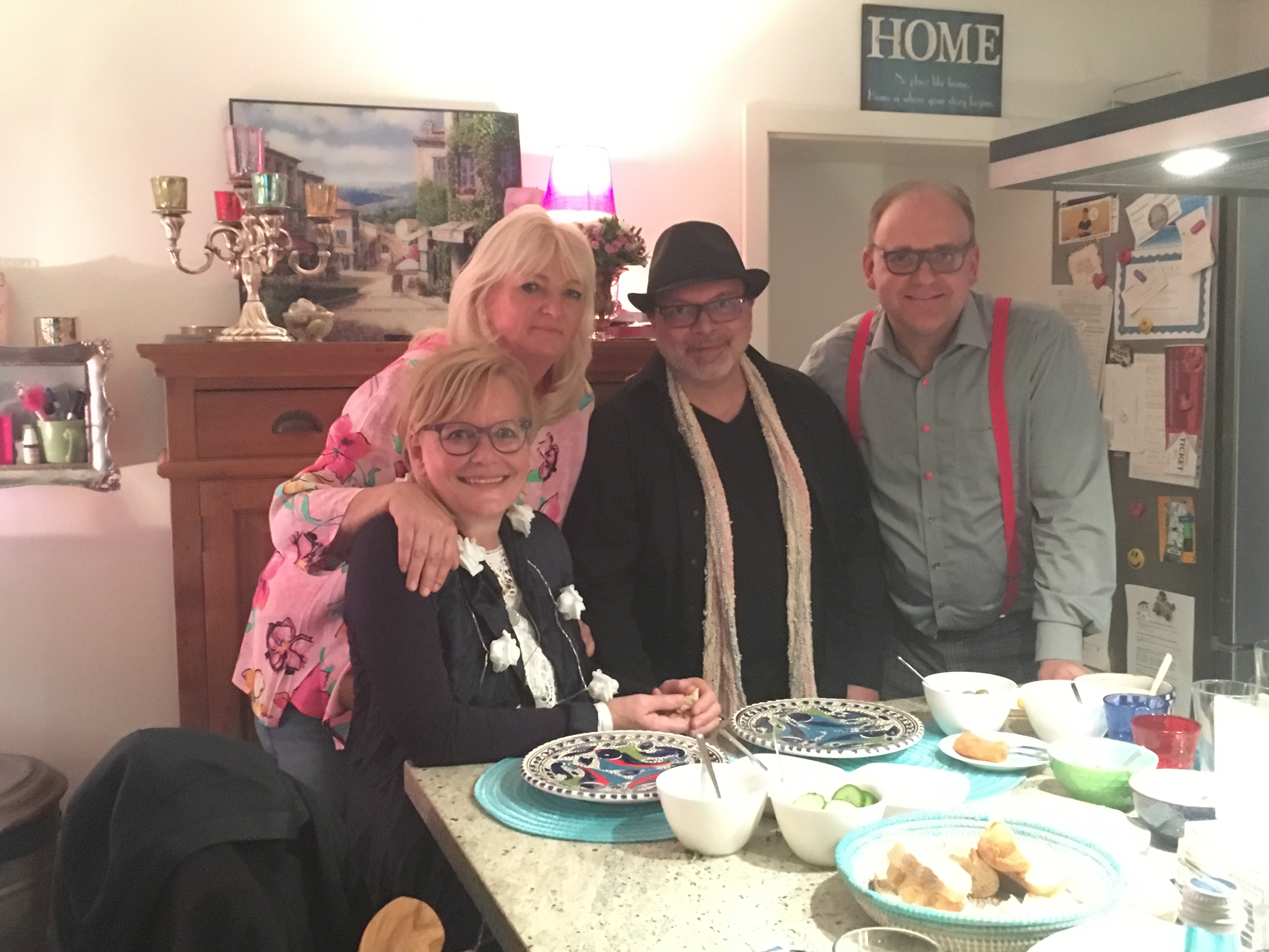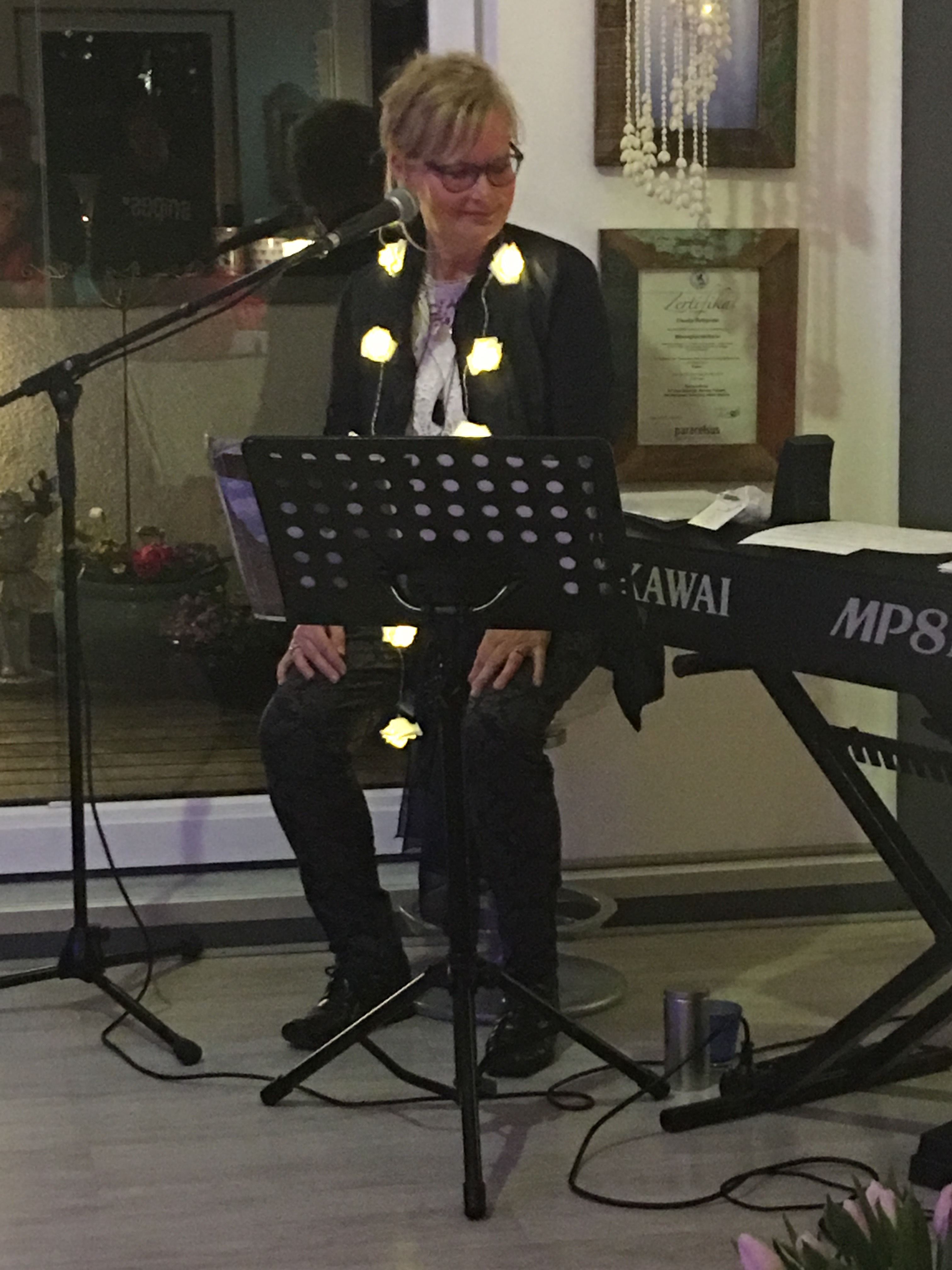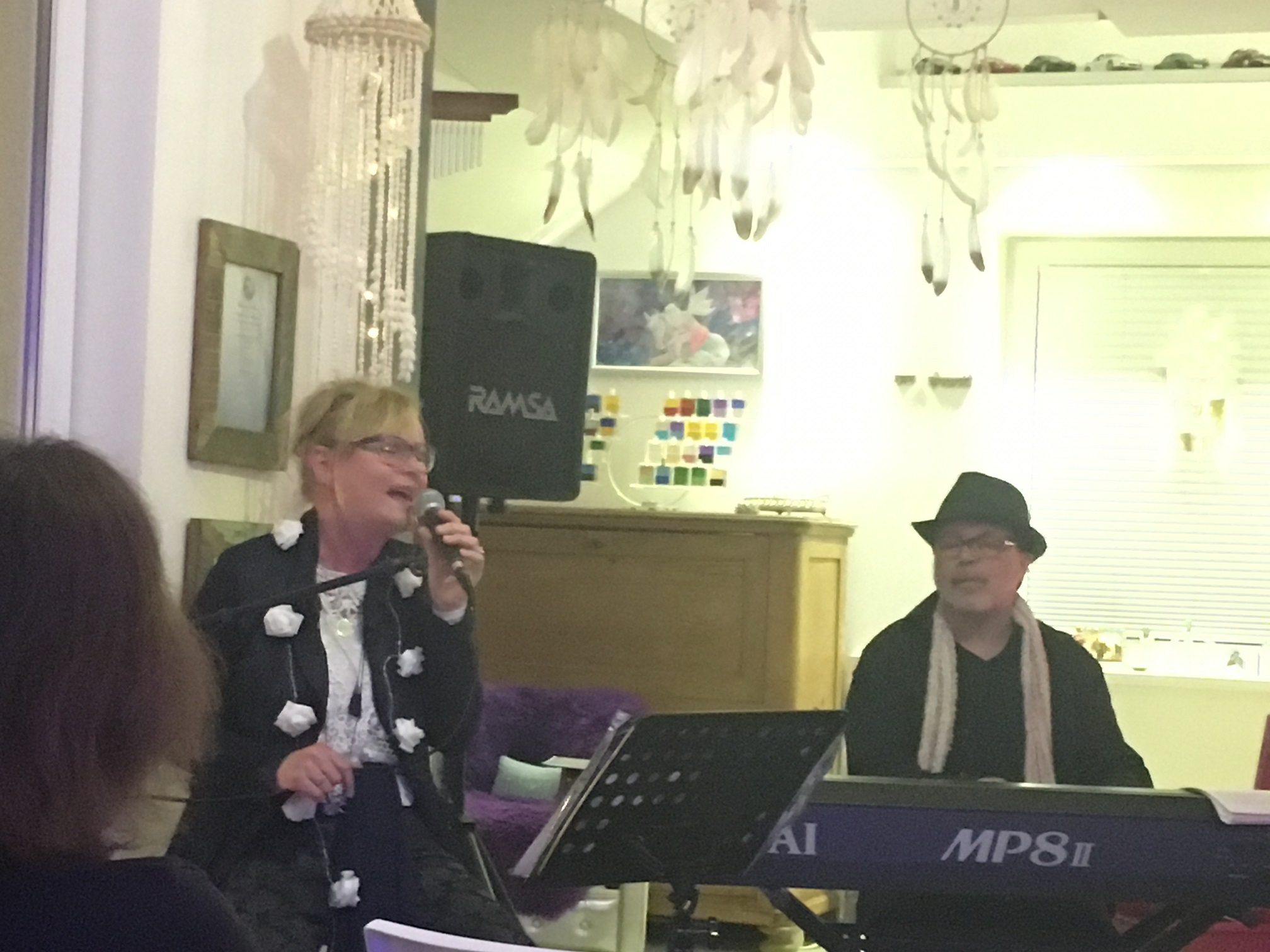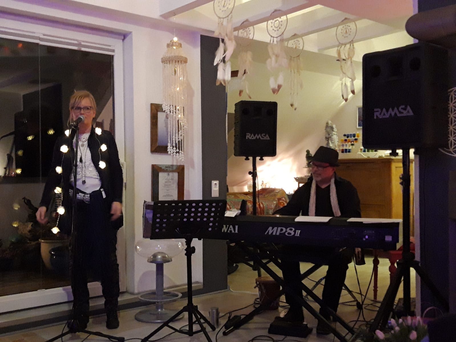 Gespannt und neugierig gingen wir hin und waren schier überwältigt. Mit viel Liebe zum Detail hatte Claudia Lichtenthäler alles vorbereitet. Die Künstler Sabine van Baaren und Mark Joggerst spielten 2 Stunden vor knapp 40 Leuten – mitten im Wohnzimmer von Claudia Lichtenthäler. Es war von Anfang an eine wundervoll warme, positive Energie im Raum. Sabine van Baaren, die in den Niederlanden geboren wurde und heute in Köln lebt und bereits mit Musikern wie Jule Neigel, Pe Werner und Reinhard Fendrich gearbeitet hat verzaubert vom ersten Ton an. Ihre Stimme nimmt einen gefangen und berührt. Mark Joggerst, der Filmmusik komponiert bildet mit seinem Spiel die perfekte Ergänzung zum Duo Joggerst/van Baaren. Lieder wie „Open your eyes“,“remember who you are“ lassen innehalten und regen zum Nachdenken an.. Ihre Version von „Imagine“, dem Klassiker verursacht Gänsehaut – spätestens in dem Moment – als alle Gäste mitsingen.