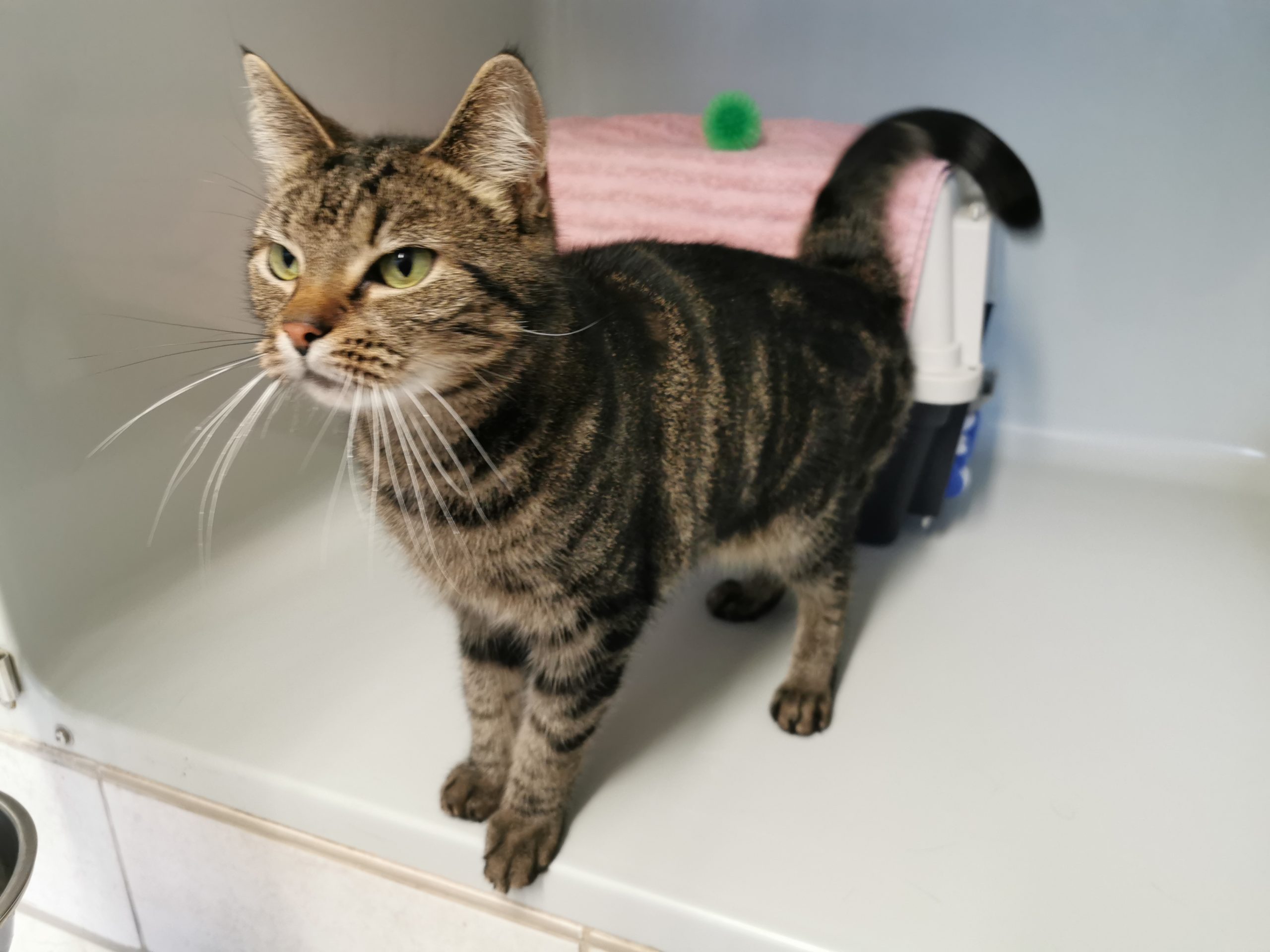 Bei so viel Zutraulichkeit dauerte es auch gar nicht lange und die schwarz-graubraun gestromte Katze mit dem weißen Kinn fand ein neues Zuhause. Zu unser aller Bedauern wurde sie dort aber von den vorhandenen Katzen gemobbt und musste deshalb wieder ins Tierheim zurückkehren.