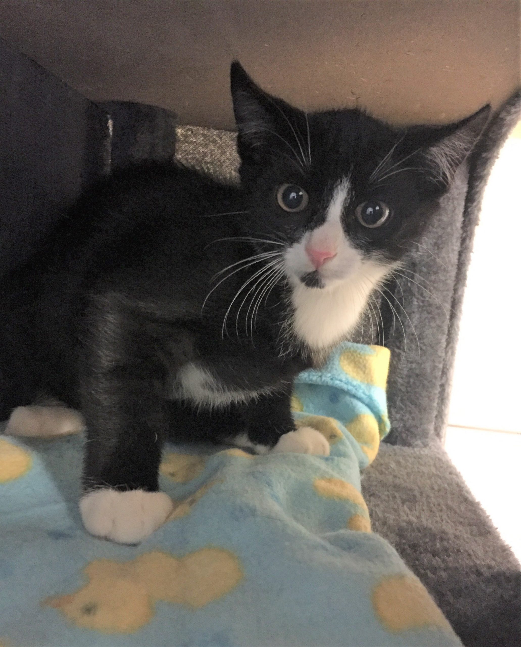 Der kleine schwarz-weiße Billa (jetzt Toni) wurde zusammen mit seinen beiden Geschwisterchen draußen aufgefunden und zu uns ins Tierheim gebracht.