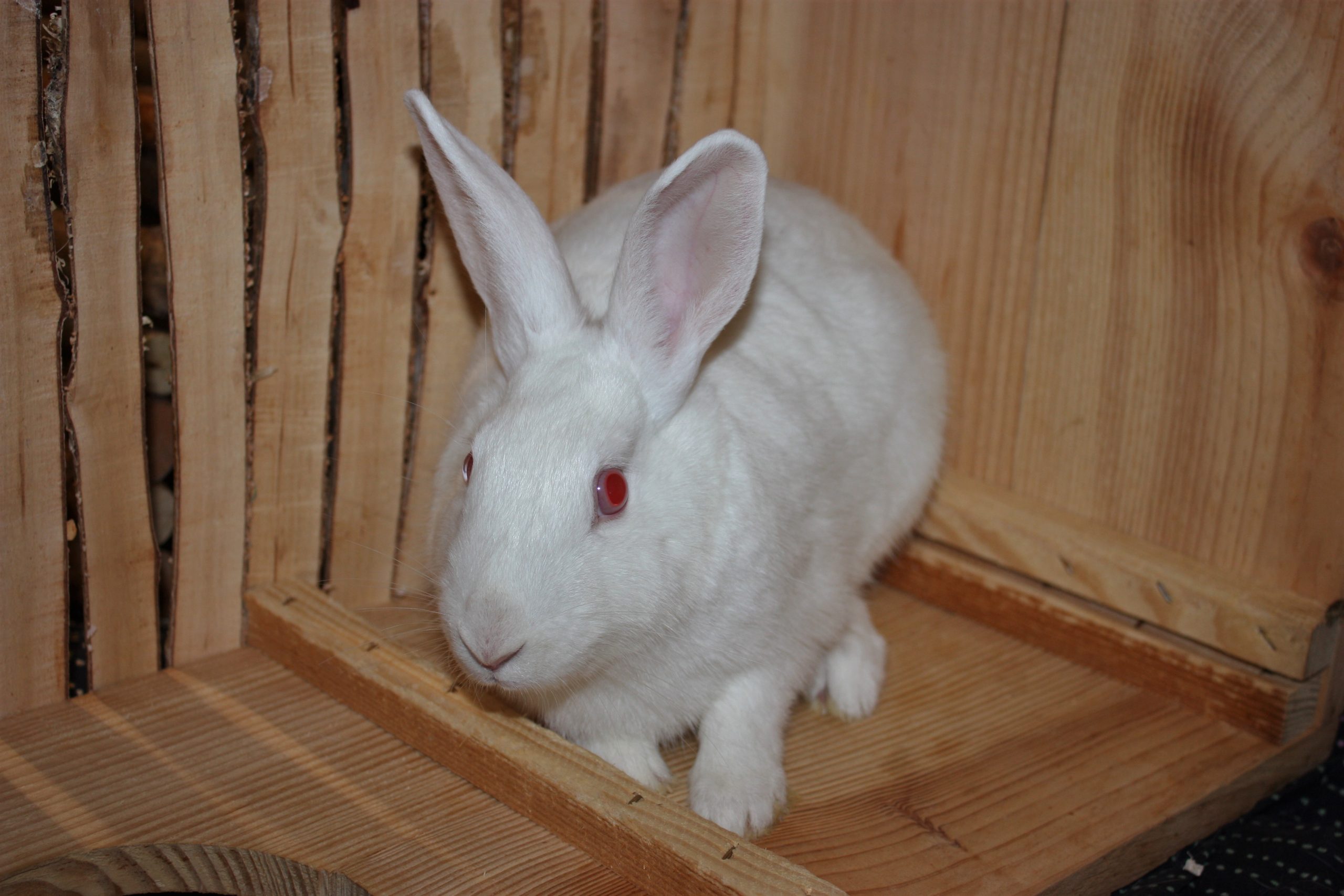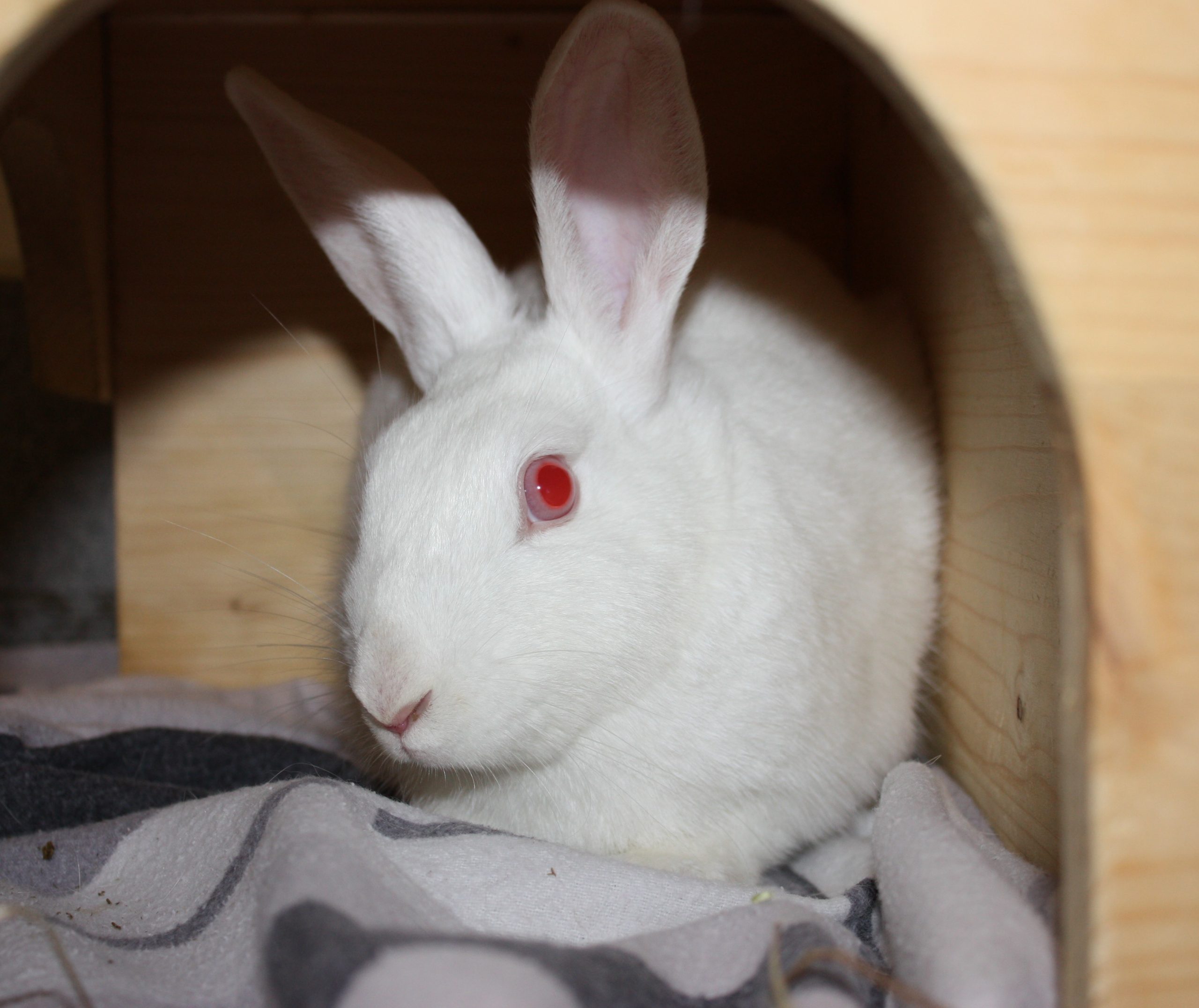 Beca und Bumper wurden eingefangen, nachdem einer Finderin eine weiße Kaninchenmutter mit mehreren Jungtieren aufgefallen war. Relativ schnell wurde klar, dass die beiden neben ihrer Angst vor Menschen auch andere Probleme haben. Sowohl der Hörsinn, als auch der Sehsinn sind bei ihnen kaum bzw. gar nicht ausgebildet und auch das für Albinokaninchen typische scannen ist vorhanden. Nach langer Zeit im Tierheim haben sie endlich ihr Glück gefunden und konnten Dank kompetenter Hilfe nach einiger Zeit der Trennung mit ihrer Mutter vergesellschaftet werden.