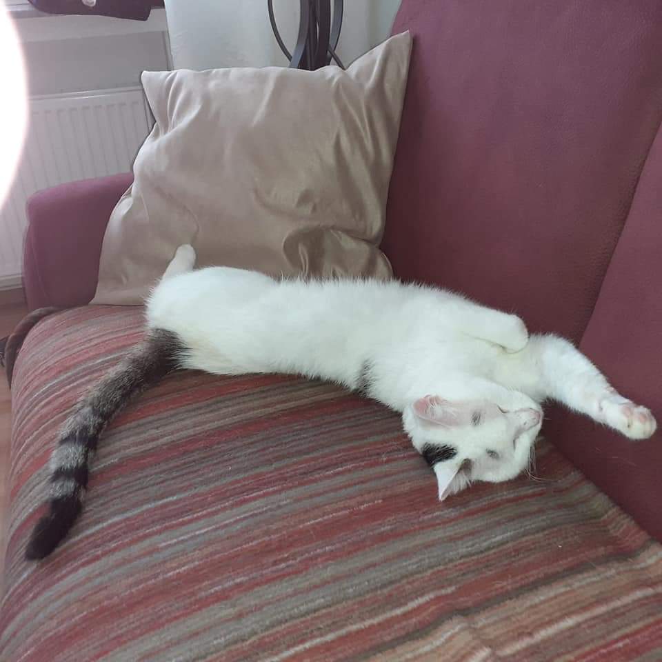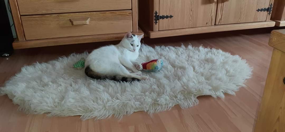 Der weiße Cracker mit den grau-gestreiften Fellfleckchen an Ohren, Rücken und Schwanz war ebenfalls gefunden und (zusammen mit Cody) in unser Tierheim gebracht worden. Er war bisher scheinbar kaum den Kontakt zu Menschen gewöhnt und dementsprechend eine „Geisterkatze“. Man sah ihn so gut wie nie, und wenn, dann reagierte er panisch mit Flucht oder fauchte vor Angst.