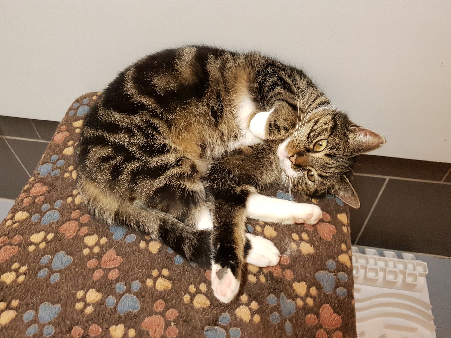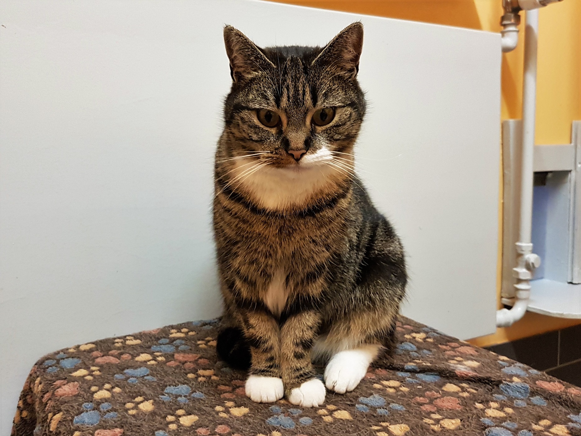 Despina ist eine niedliche und verschmuste Katzendame mit graugetigertem Fell, weißem Lätzchen und weißen Pfötchen, die als Fundtier zu uns kam.