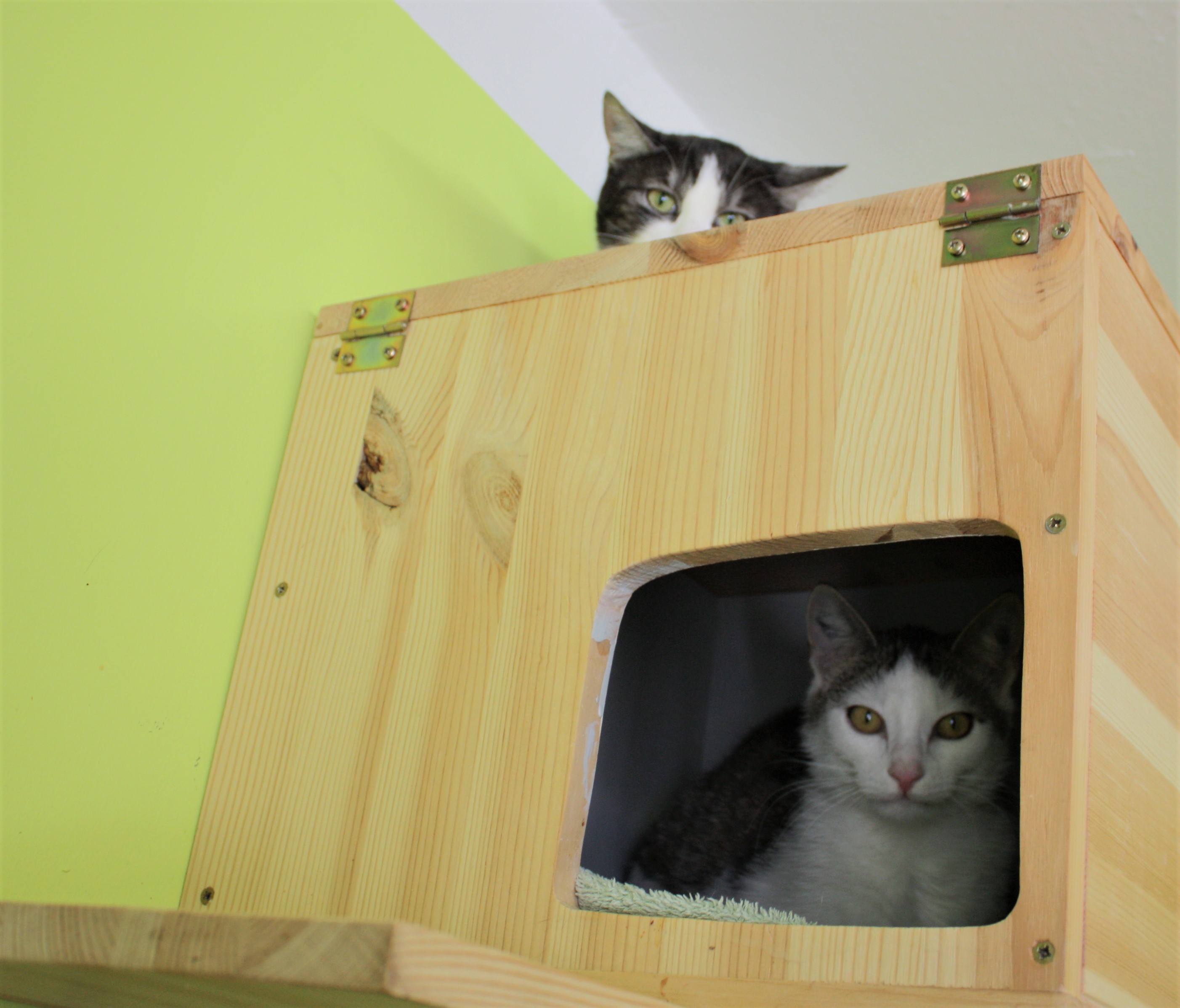 Von hier aus wollte das fellige Freundespärchen am liebsten gemeinsam in ein neues Zuhause ziehen, denn die beiden schüchternen Minitiger lagen gerne beide aneinander gekuschelt in einem Katzenversteck, um von dort aus die „Welt der Stube“ zu beobachten.