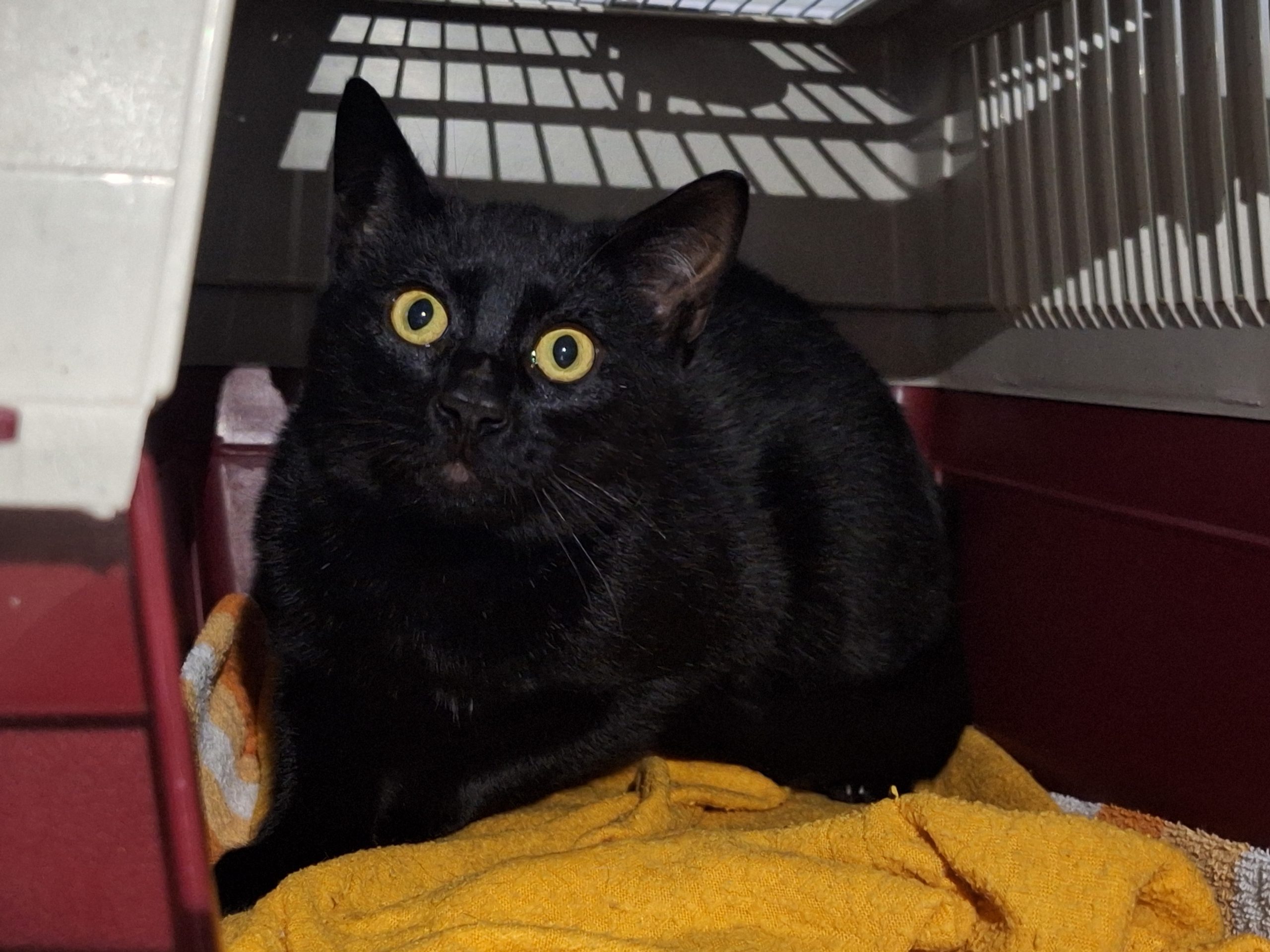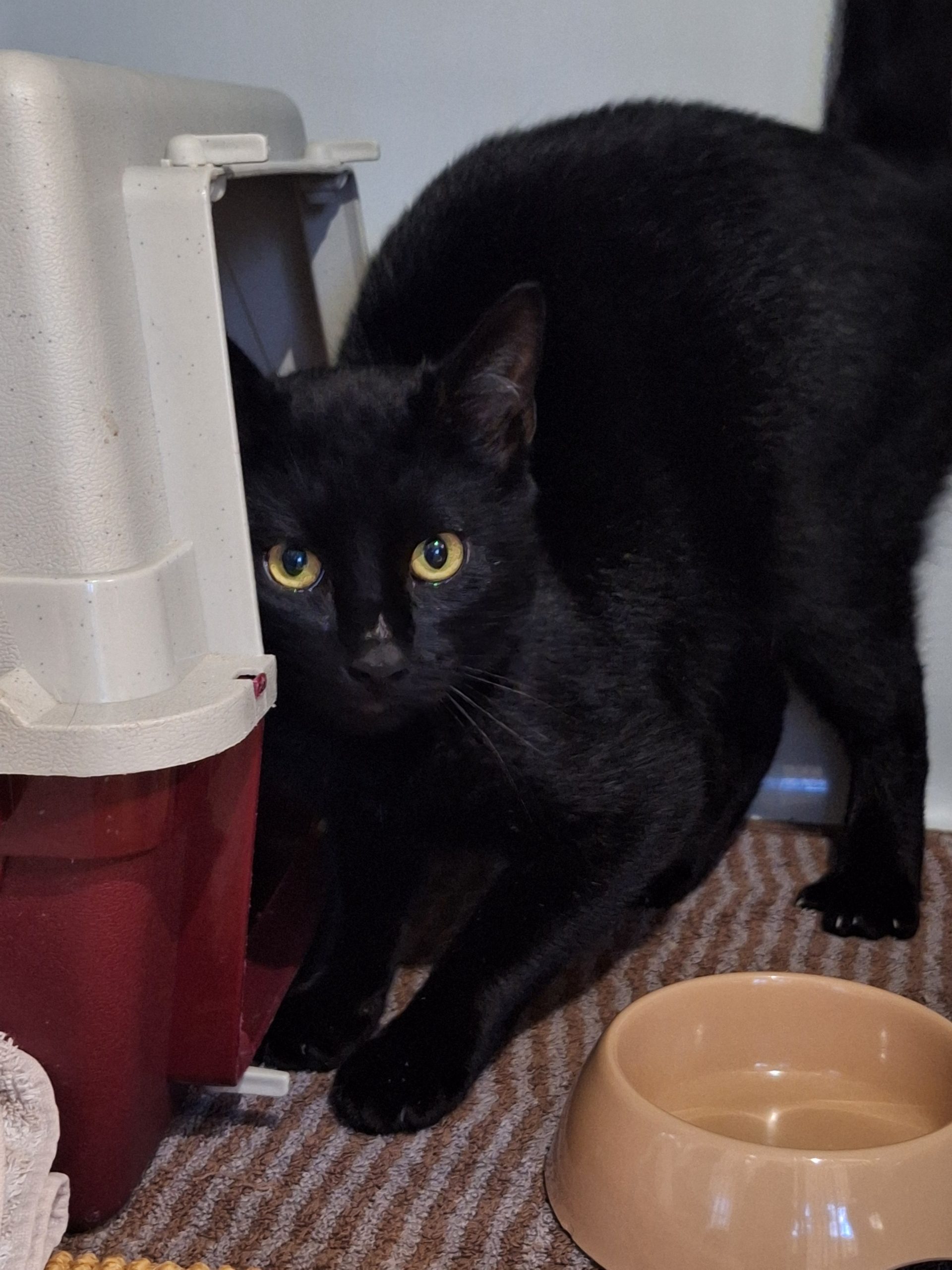 Der schwarze Kater zeigt sich bei uns noch sehr scheu und zurückhaltend, aber mit viel Zeit, Ruhe und Geduld fasst er zunehmend Vertrauen und akzeptiert die Nähe des Menschen, auch wenn er weiterhin eher skeptisch bleibt.