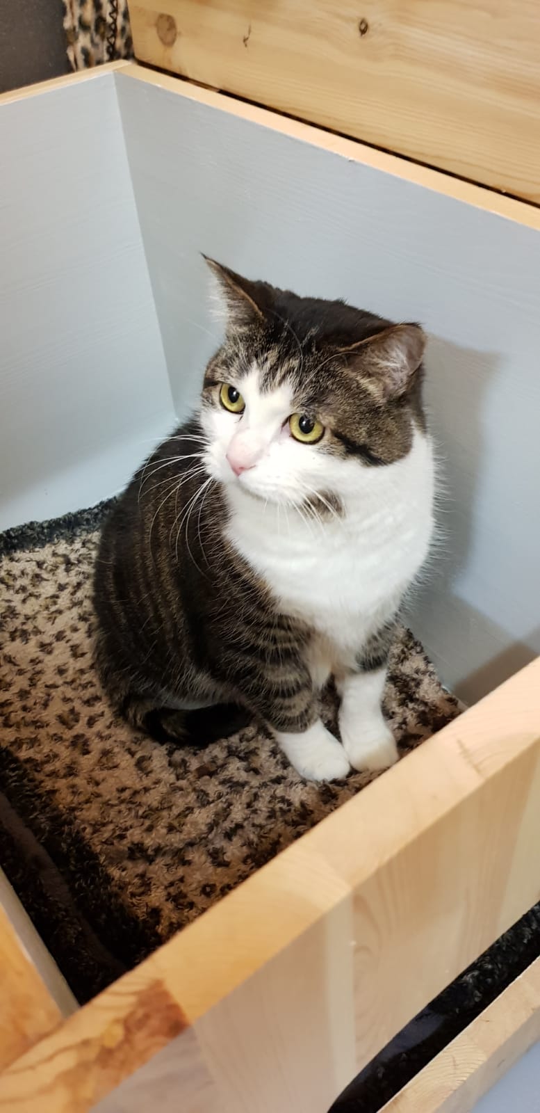 Der hübsche, grau-weiß getigerte Felix mit dem schönen Katerkopf und der interessanten Gesichtszeichnung musste abgegeben werden und zu Beginn seines Aufenthaltes im Tierheim schien er sich noch nicht sicher, was er jetzt davon eigentlich halten sollte.