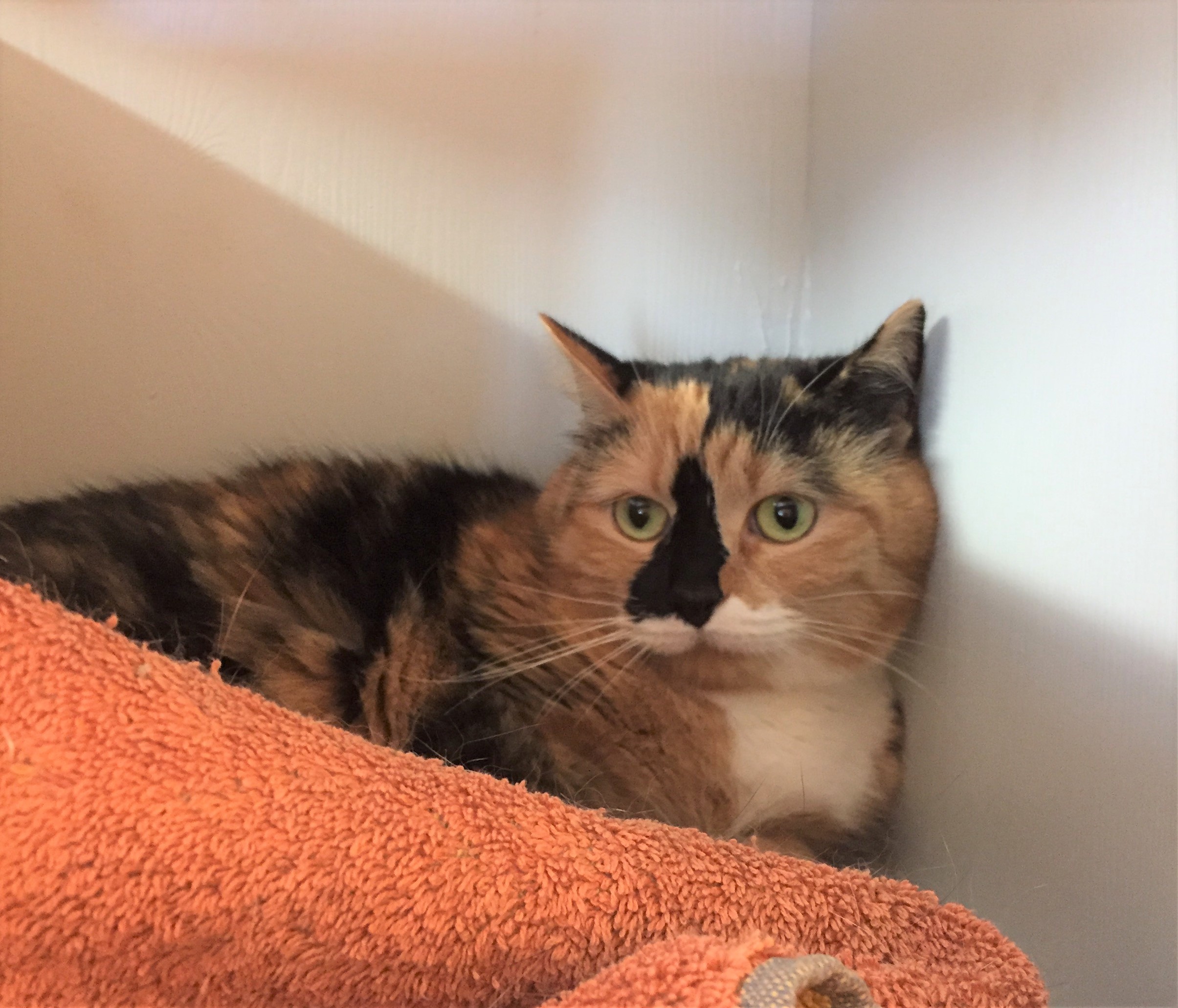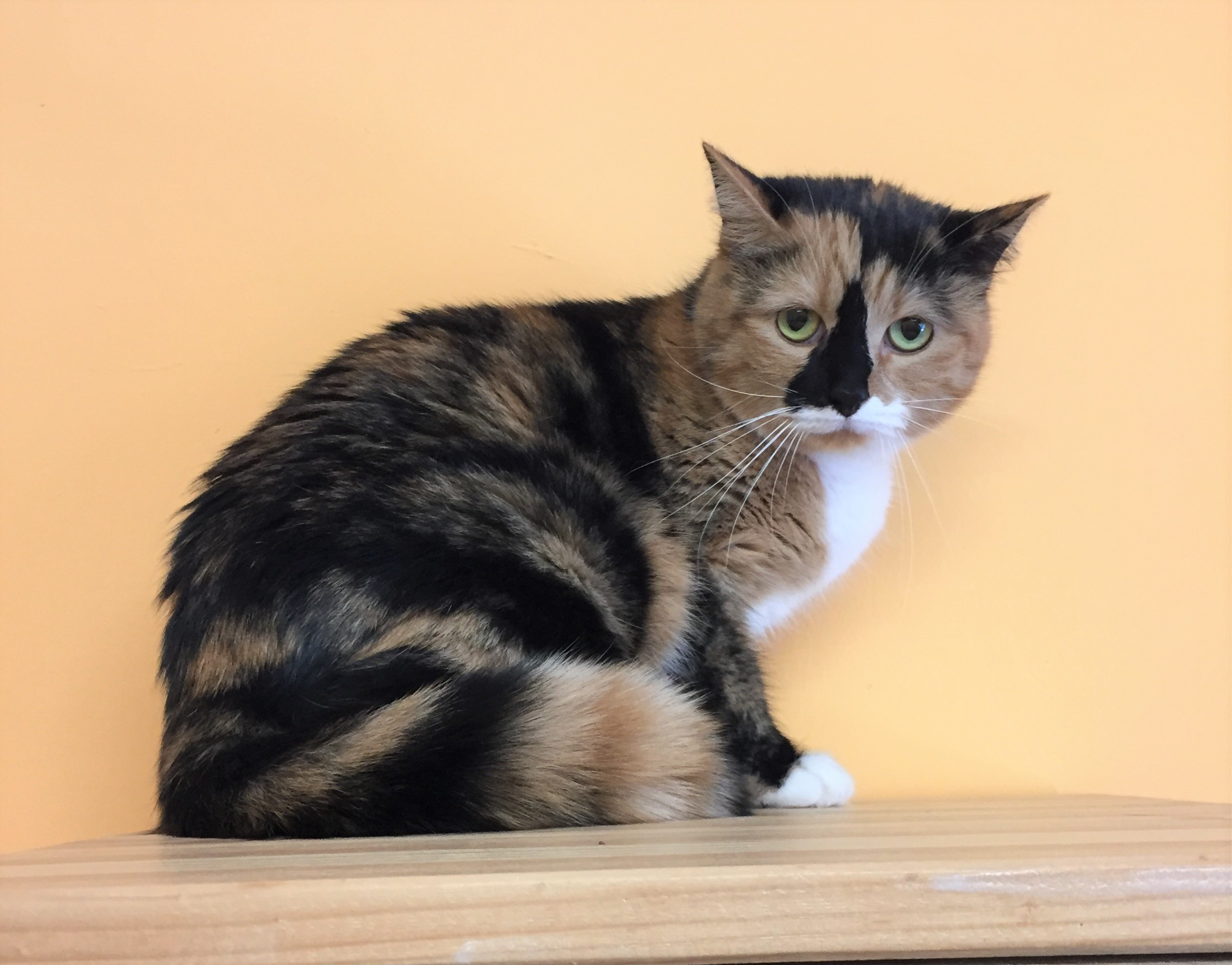 Die dreifarbige Samtpfote macht zwar hier einen schüchternen Eindruck und ist den Menschen gegenüber noch sehr misstrauisch, doch von den Vorbesitzern wurde sie als anhänglich und äußerst verschmust beschrieben. Die Hübsche spielt außerdem gerne mit kleinen Bällen oder Toilettenpapierrollen.
