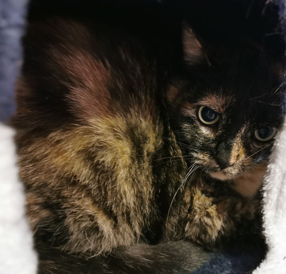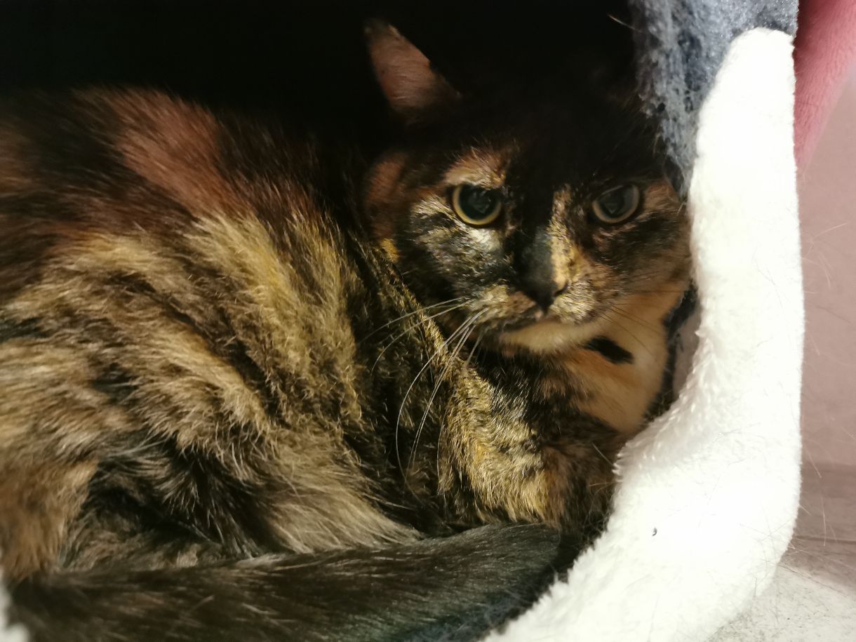 Die hübsche getigerte/Schildpatt Fellnase hatte ihr Zuhause verloren. Im Tierheim versteckte sie sich – wenn irgendwie möglich – in einer der Kuschelhöhlen in der Katzenstube. Ganz vorsichtig durfte man sich Frieda nähern und dann hat sie die sanften Streicheleinheiten doch etwas genießen können.