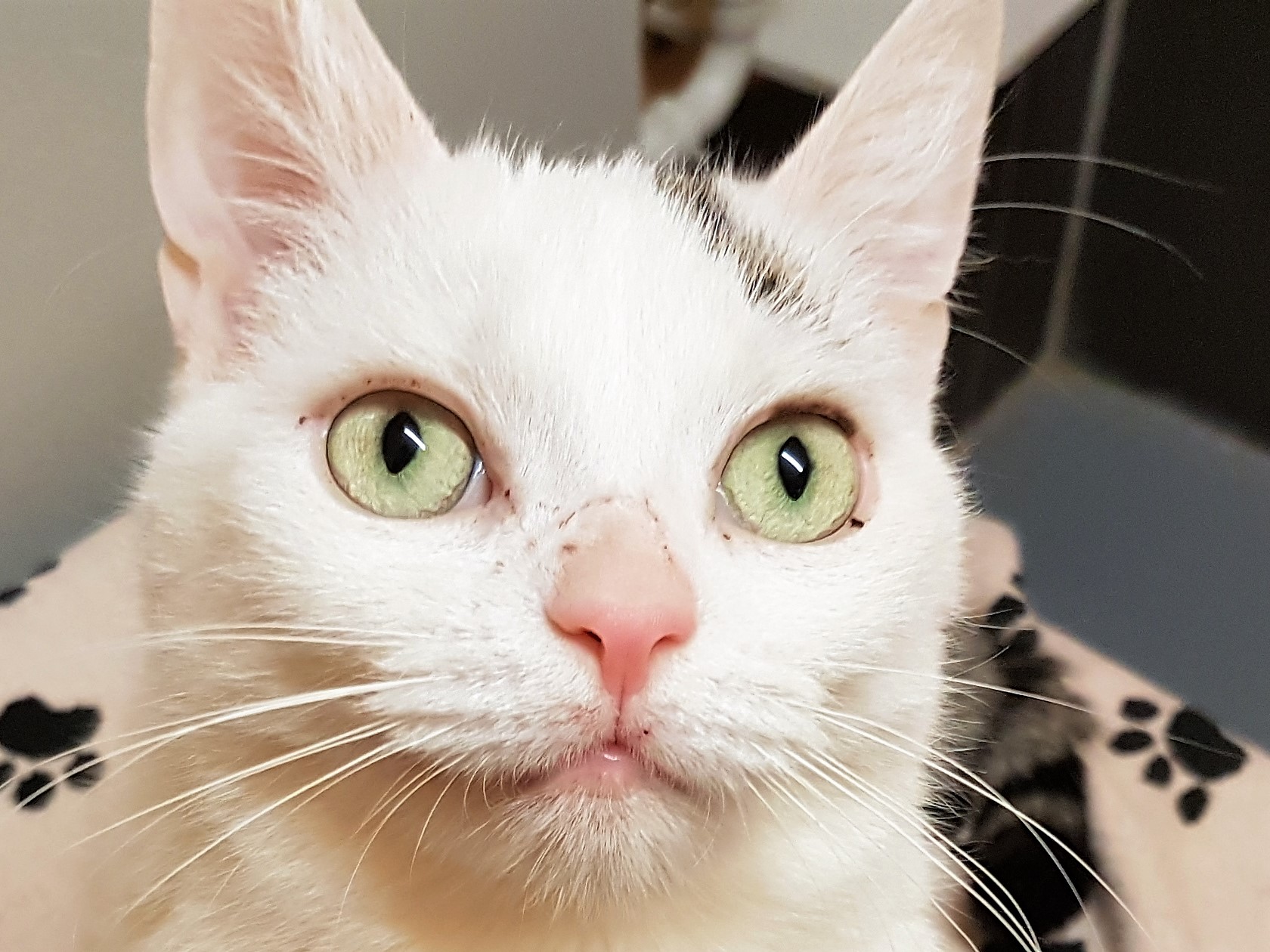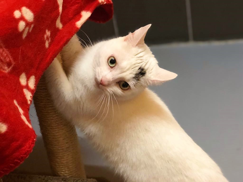 Schnell fand die liebenswerte weiße Katze mit dem schwarzen Fleck auf der Stirn und den ausdrucksvollen Augen, ihre Familie, und durfte bereits in ihr neues Für-Immer-Zuhause umziehen.