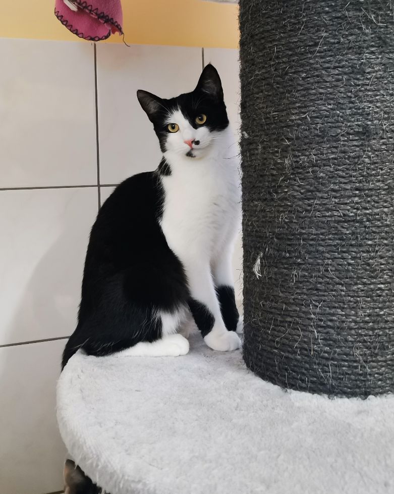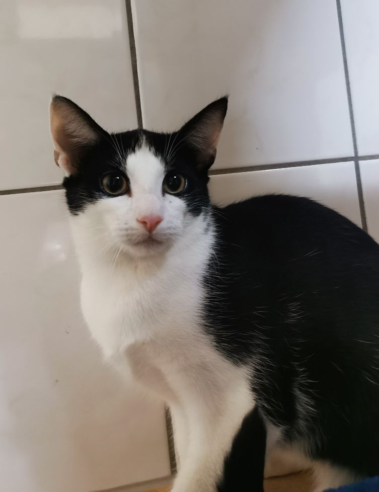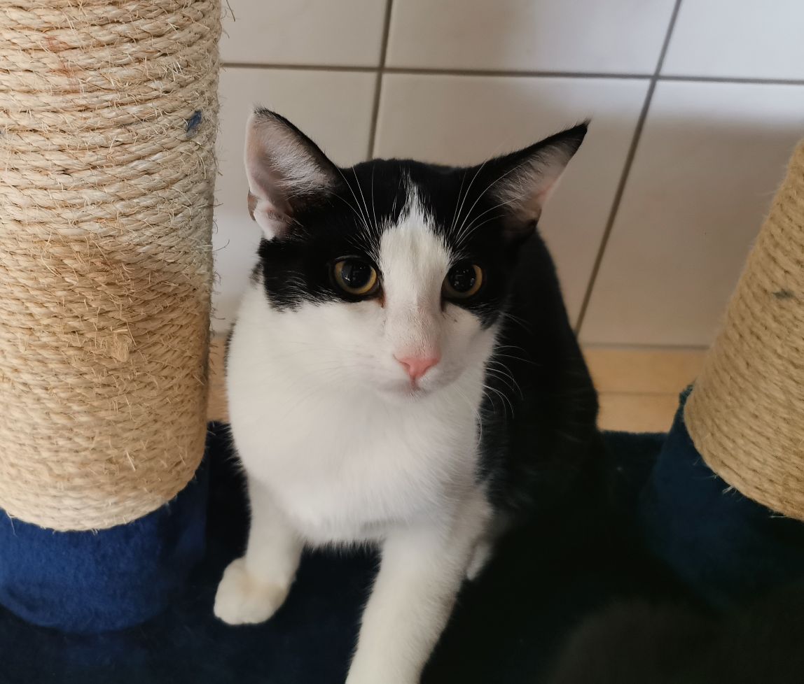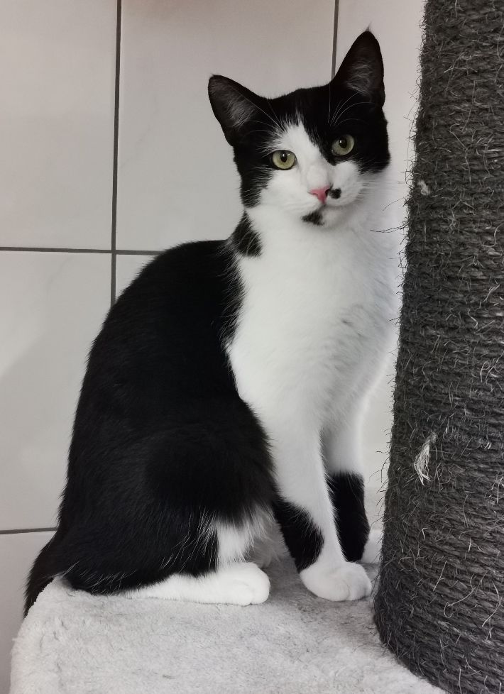 Die hübschen schwarz-weißen Jungkatzen Gwen und Jacob waren als Babys mutterlos von einer Tierschützerin aufgefunden und zu uns ins Tierheim gebracht worden. Hier lernten sie sich in unserer Kittenstube kennen und gehörten in der „Krabbelgruppe“ eher zu den schüchterneren kleinen Vertretern ihrer Art.
