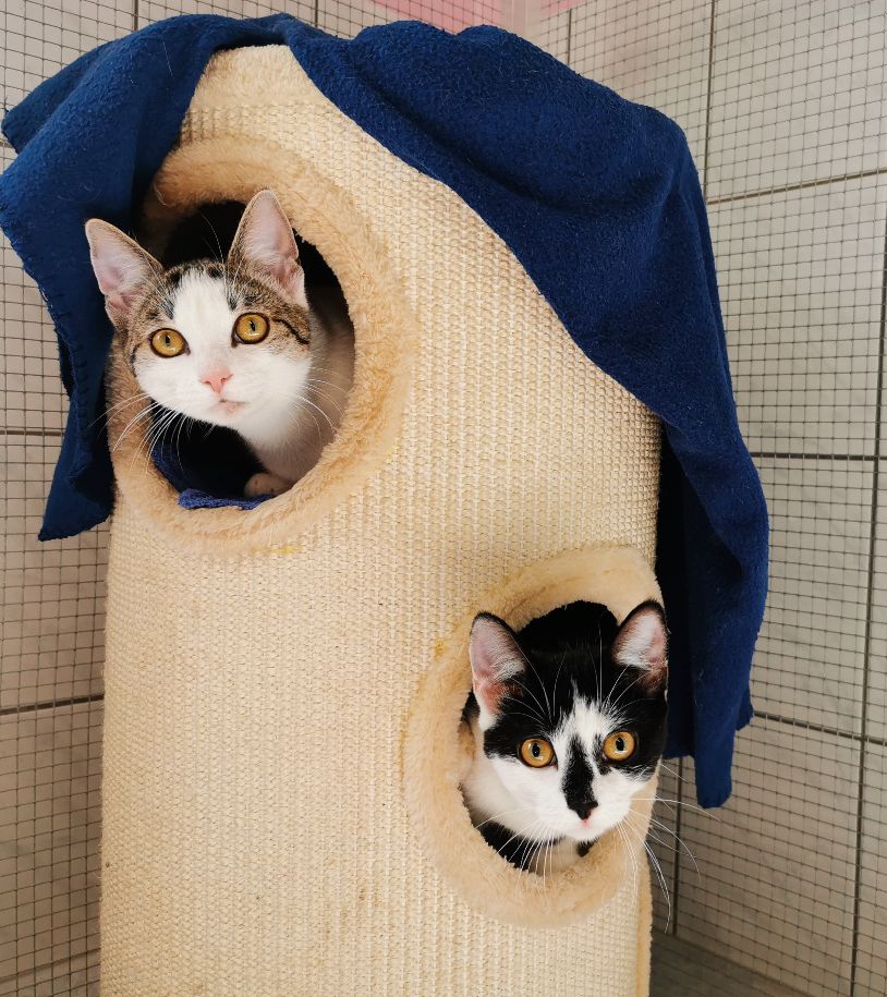 Die beiden niedlichen Kätzchen sorgten schon im zarten Alter von wenigen Tagen für Aufsehen. Sie waren gemeinsam mit vier weiteren Geschwisterchen einfach wie Abfall in einem Müllcontainer in Wülfrath „entsorgt“ worden. Es war unglaubliches Glück, dass sie rechtzeitig gefunden – und in unser Tierheim gebracht worden waren. Hier kümmerte sich eine Pflegerin aufopferungsvoll um die Handvoll Fellchen und nahm sie mit zu sich nach Hause. Alle wuchsen zu jungen und lebhaften Katzenkindern heran, die bald jeweils zu Zweit in die Obhut eines fürsorglichen Zuhauses entlassen werden konnten.