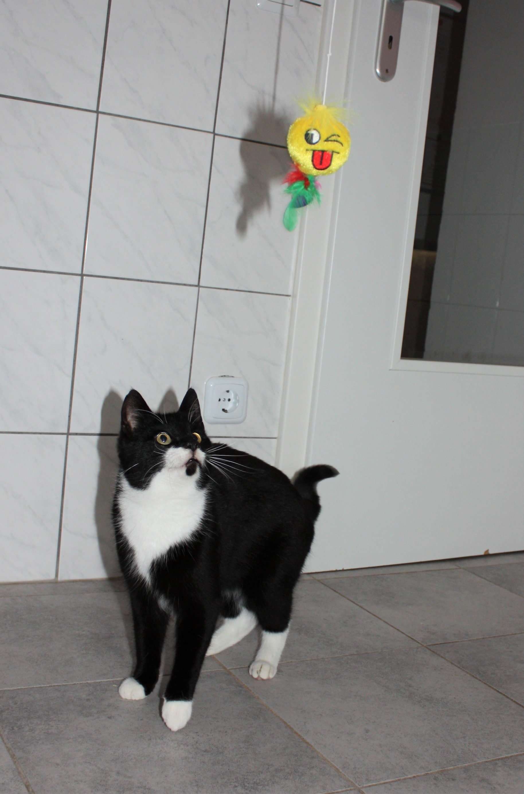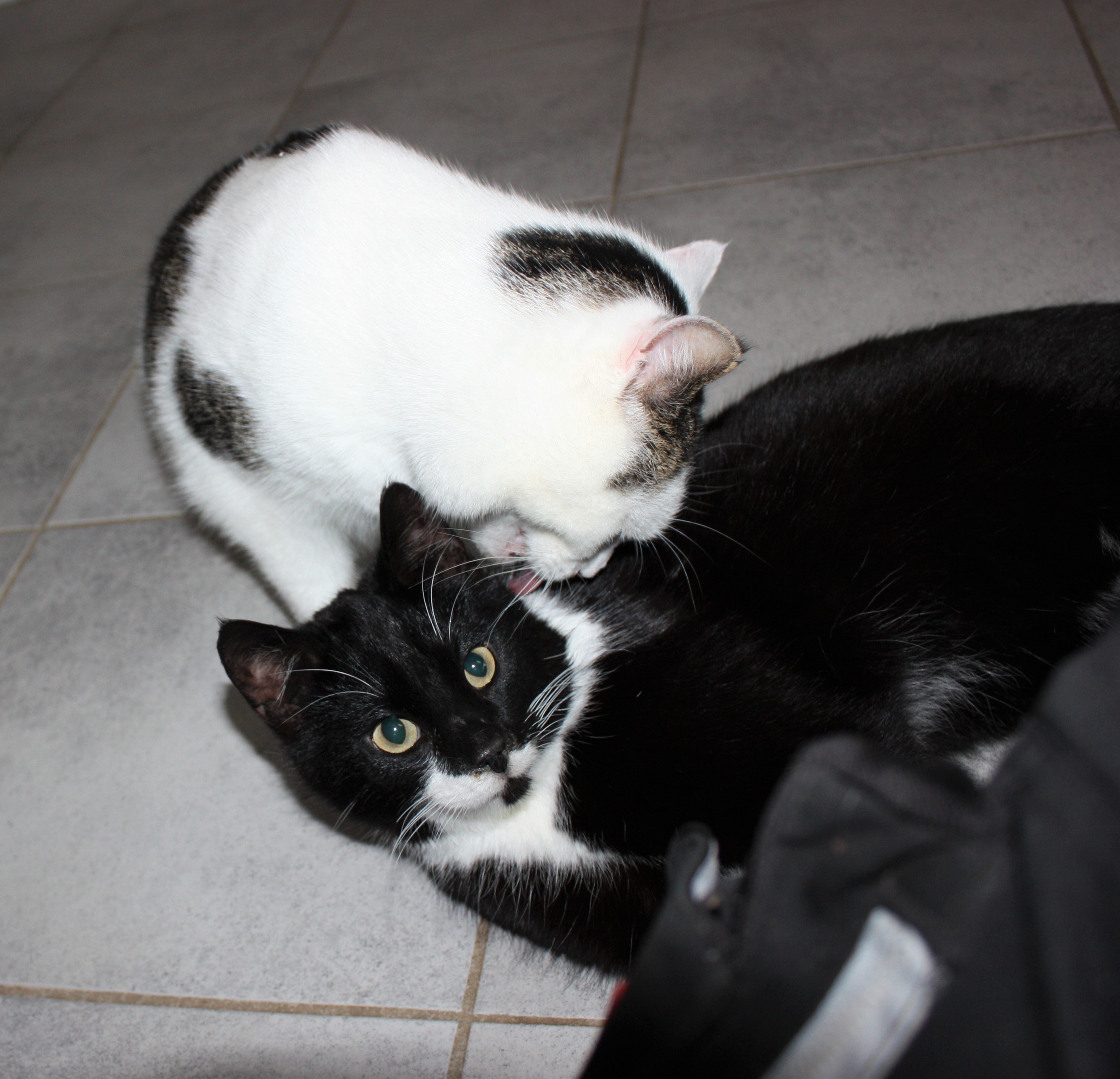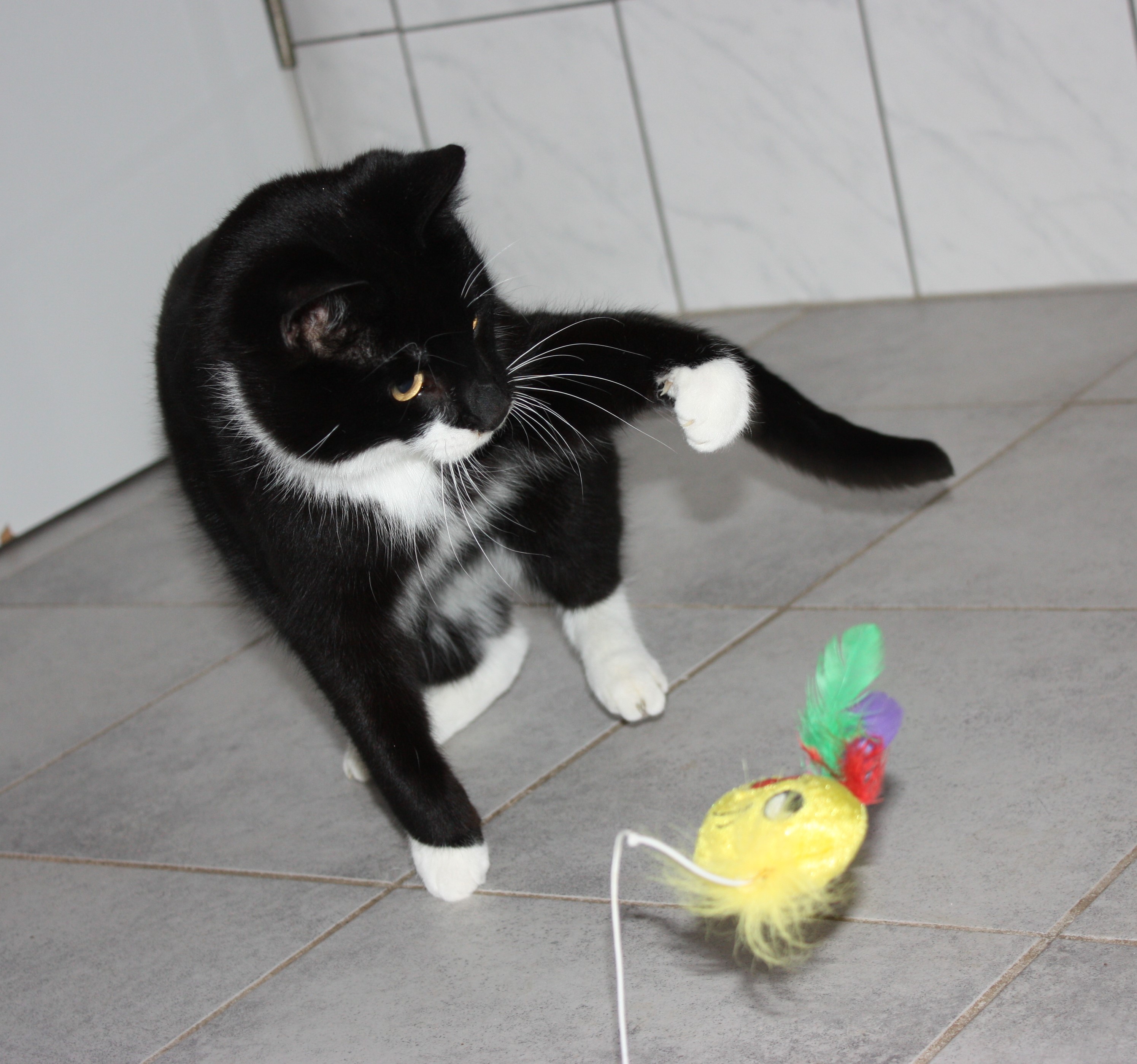 Die beiden Stubentiger haben chronischen Schnupfen – das stört sie aber überhaupt nicht, ganz im Gegenteil: Henry und Muffin sind sehr quirlig und verspielt. Ob nun mit einem Ball, Intelligenzspielzeug oder eine Spielangel macht keinen Unterschied. Da wird gejagt, über den Boden gerollt und getobt. In kurzen Spielpausen putzt man sich erstmal gegenseitig oder trägt ein kleines Kämpfchen aus.