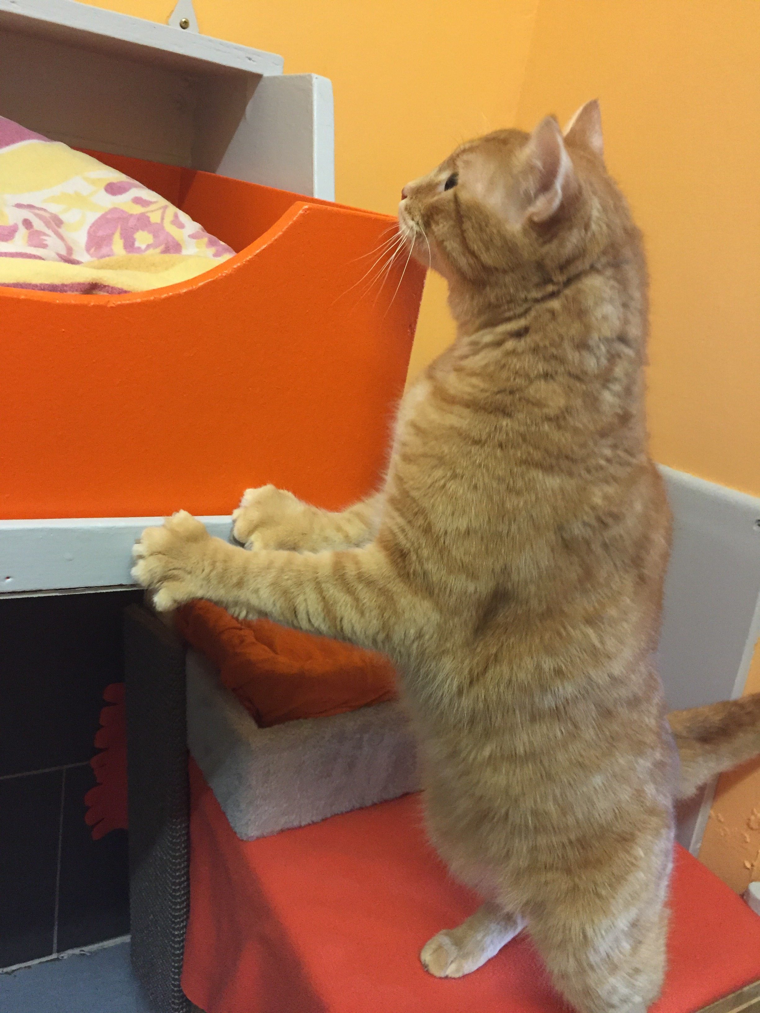 Der hübsche Rot-Tiger zeigt das typische Verhalten eines Katers, der von klein auf ohne Artgenossen gehalten wurde und keine gute Kinderstube genossen hat. So hat er nur wenige Grenzen kennengelernt und ist es gewohnt seinen Willen zu bekommen.