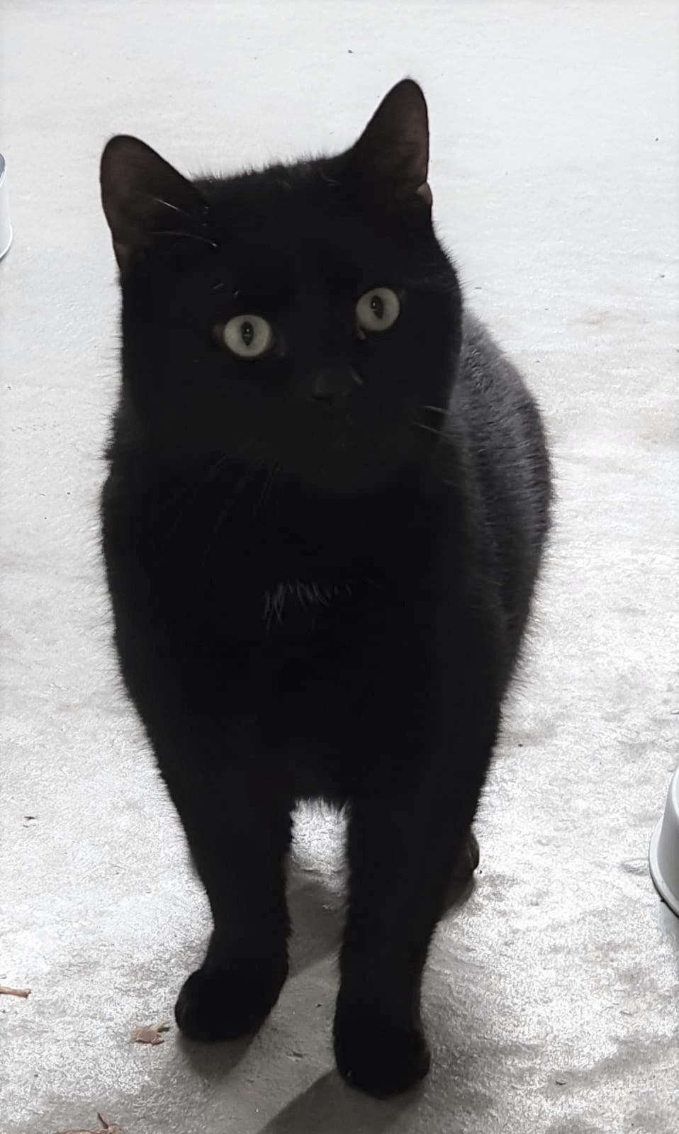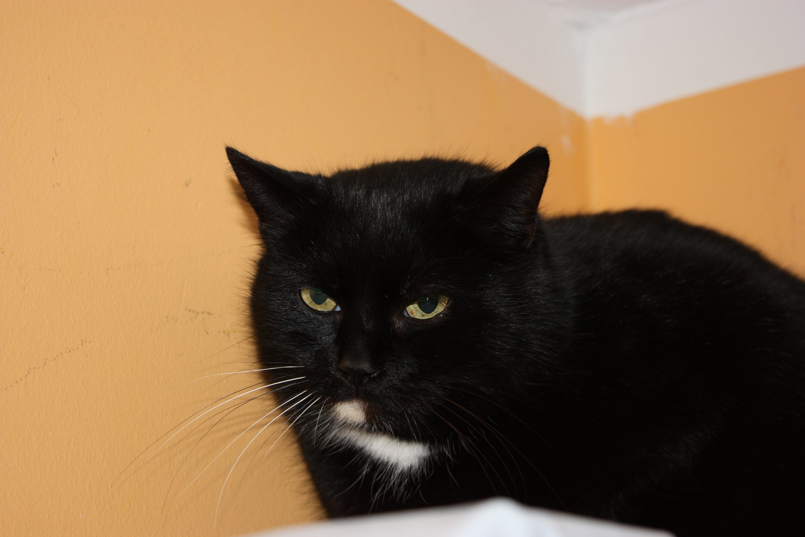 Julia, eine hübsche schwarze Katze mit kleinen weißen Flecken an Kinn, Brust und Hinterpfötchen, wurde in einem Schrebergarten gefunden und zu uns ins Tierheim gebracht.