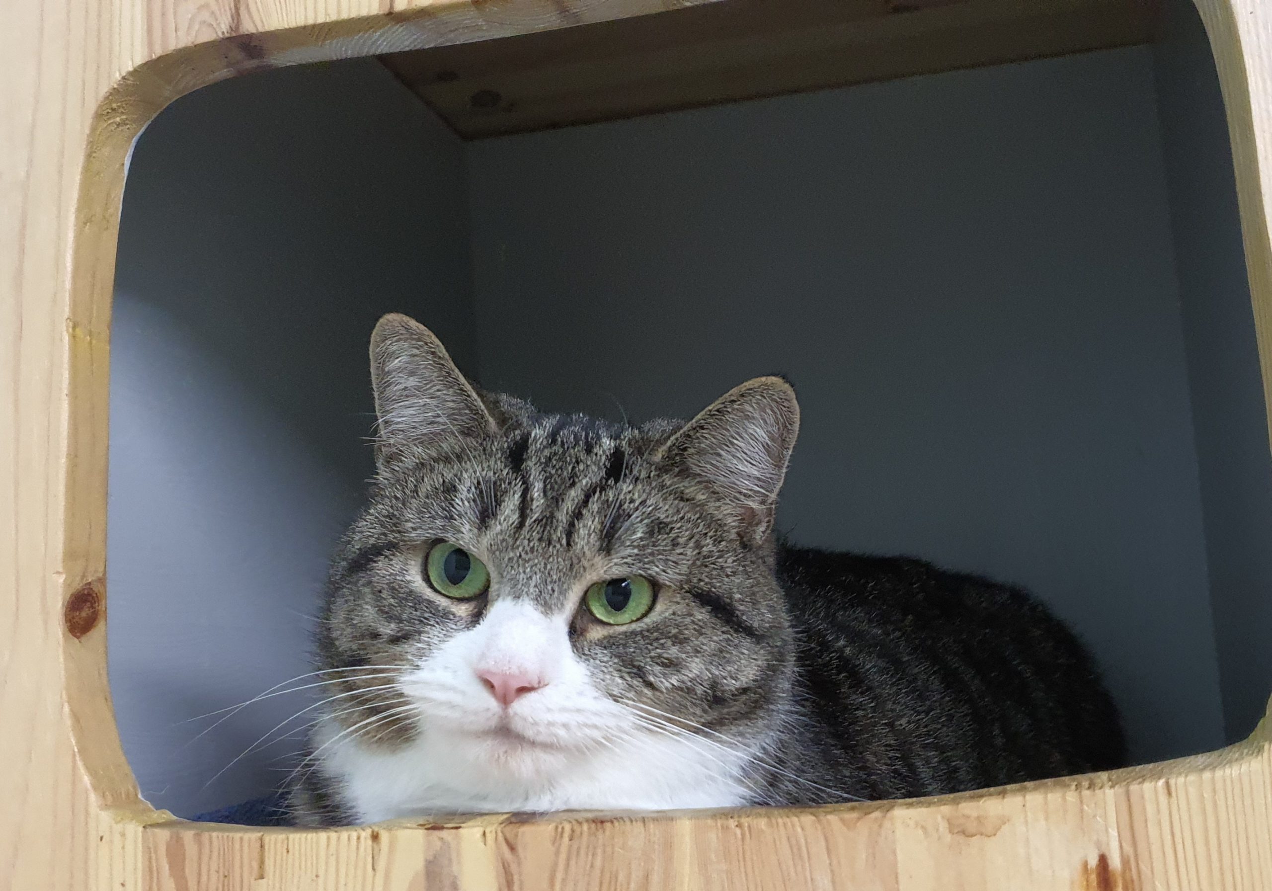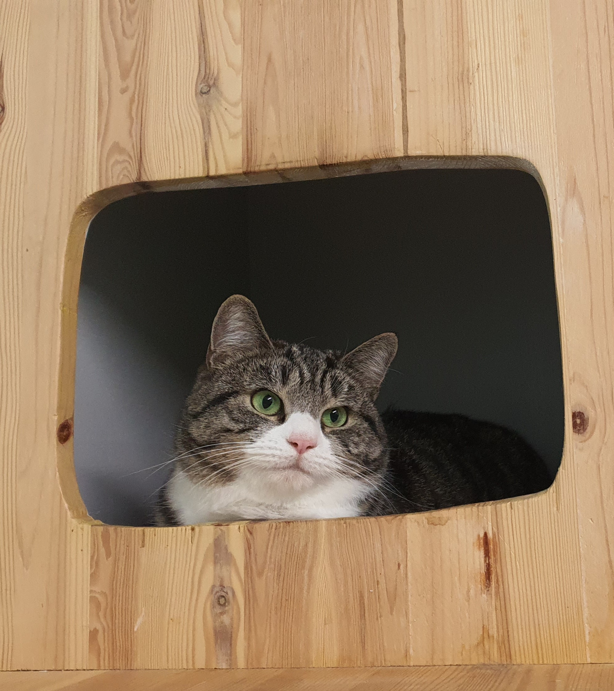 Dennoch hat Katjes ein ganz bezauberndes Wesen und nahezu alle Mitarbeiterinnen und Katzenkuschlerinnen erlagen ihrem Charme, wenn die niedliche Zuckerschnute aus ihrer bevorzugten Kuschelhöhle mit Blick auf den Gang durch die Glastür hindurch mit ihren Besuchern „schwatzte“. Oder wenn für ein feines Leckerchen ihr Misstrauen kurzzeitig Nebensache wurde und sie ihren Rückzugsort verließ.
