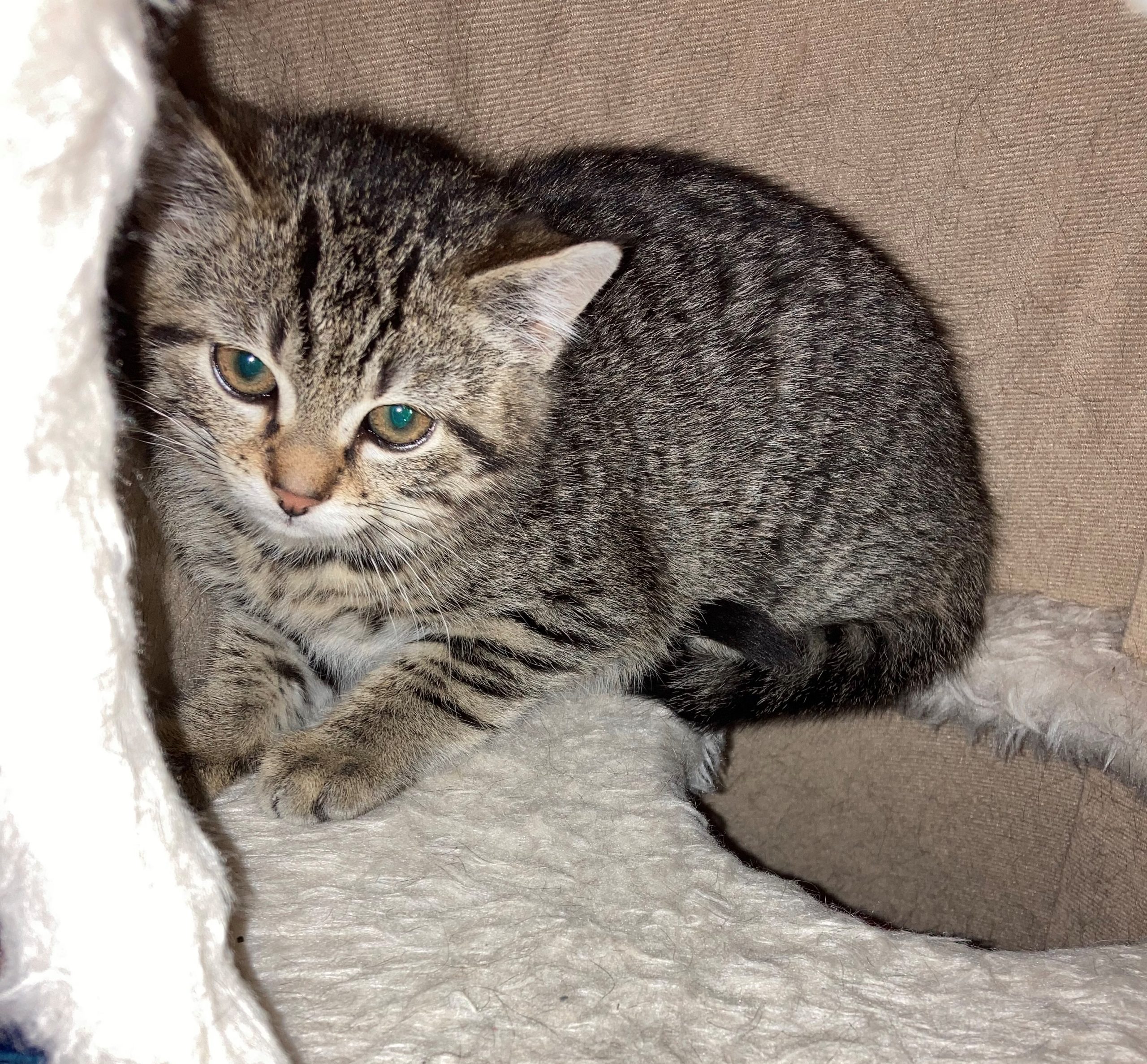 Die kleine Kiki wurde draußen gefunden und zu uns ins Tierheim gebracht. Das niedliche graugetigerte Katzenmädchen zeigte sich in den Katzenstuben sehr ängstlich. Vermutlich hat sie bisher in ihrem jungen Leben noch nicht viel Kontakt zu Menschen gehabt und wenn man sich der Minimaus näherte, wurde erst einmal gefaucht und Kiki versuchte, sich rasch zu verstecken. Ließ‘ man sich davon jedoch nicht abschrecken und hatte sie erst einmal auf dem Arm, dann merkte das hübsche Kätzchen, dass das doch gar nicht so unangenehm ist und fand es meist bald darauf sogar richtig toll, gestreichelt zu werden. Mit der nötigen Geduld wird sie sicher Vertrauen zu ihren Bezugspersonen fassen und eine große Schmuserin werden.