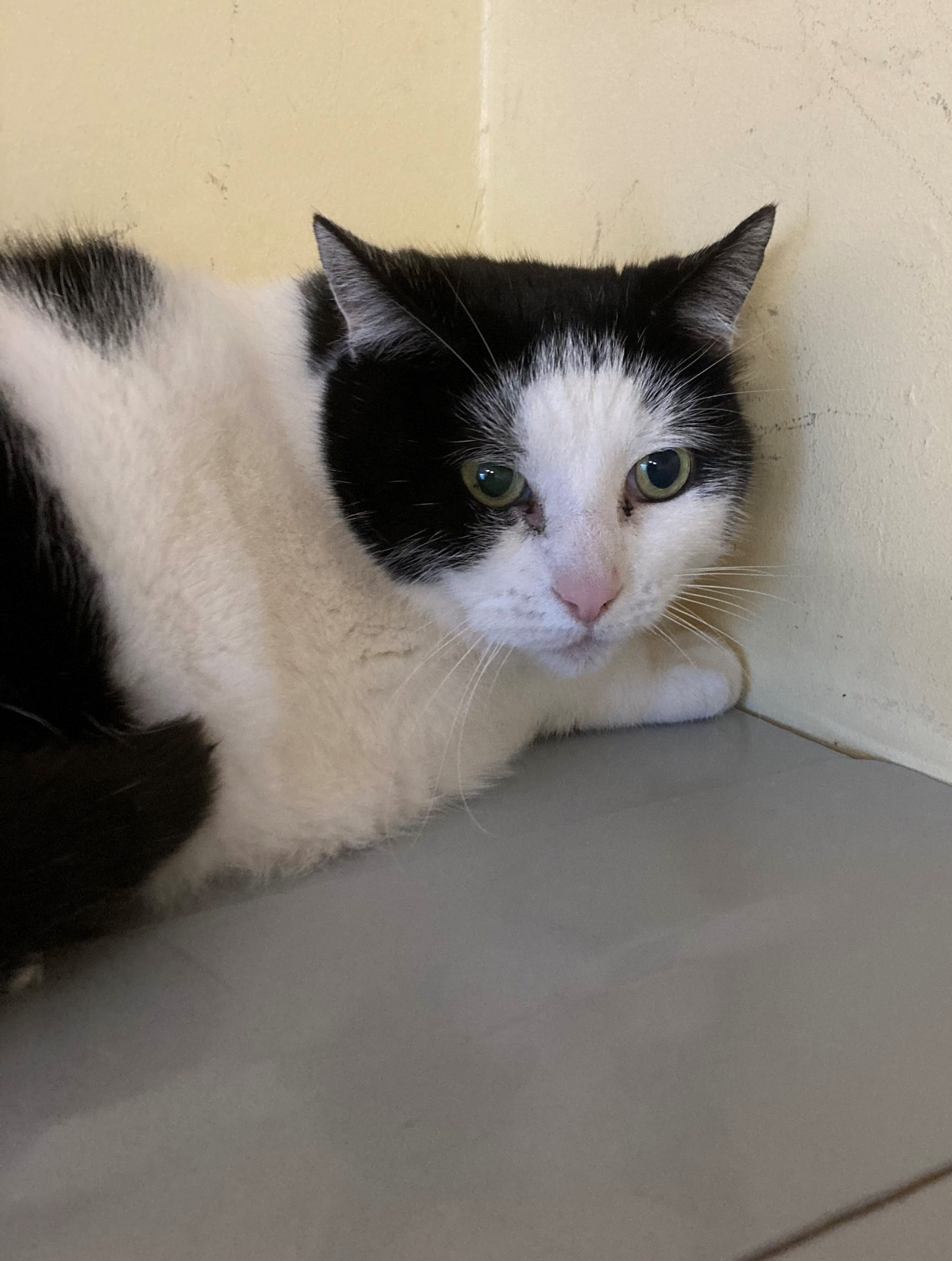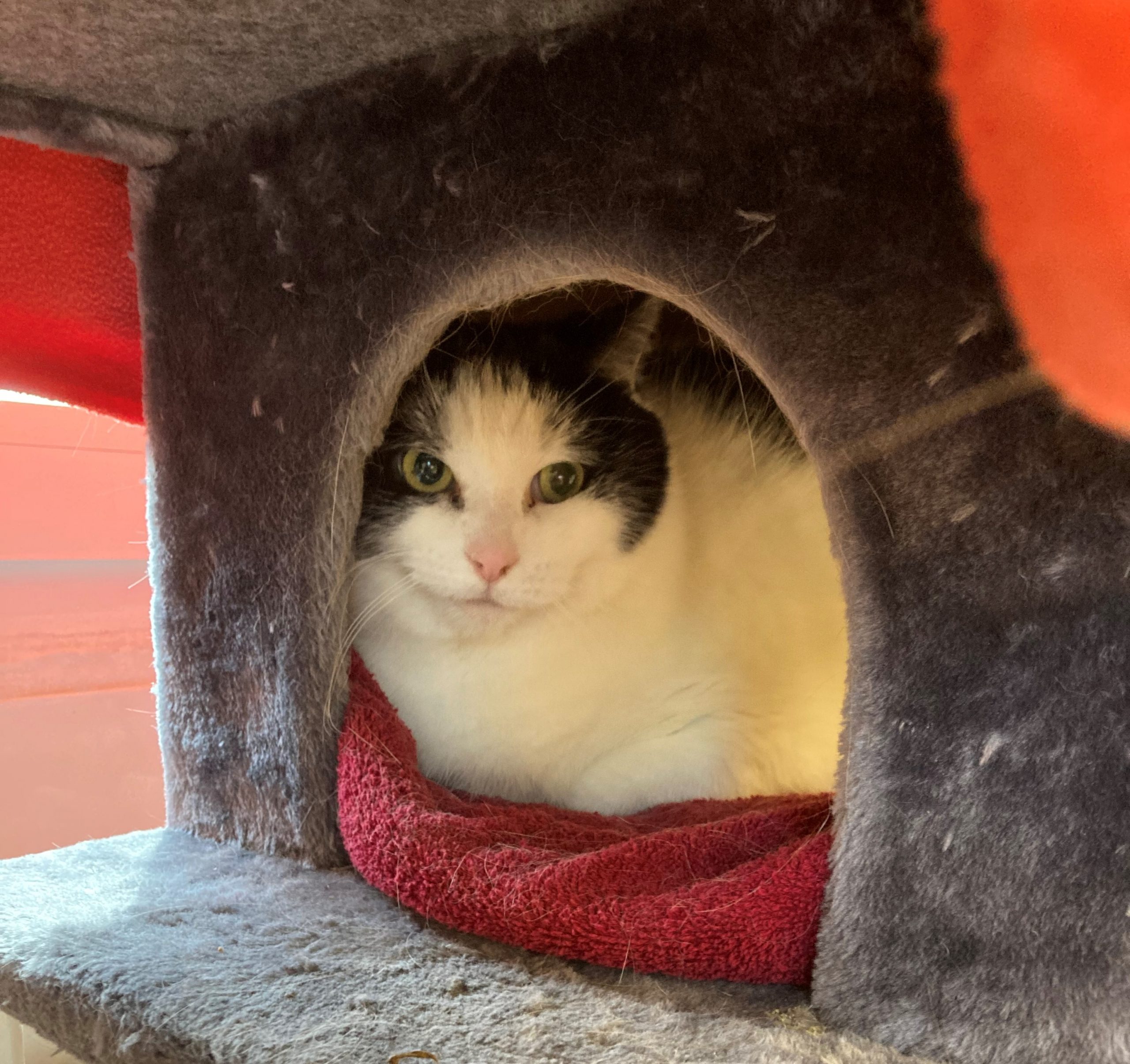 Die schwarz-weiße Merle kam im Juni dieses Jahres zu uns ins Tierheim. Hier bewohnte die sanfte Katzendame mit einer sehr liebenswerten „Rentner-Gang“ die Katzenstube und saß gerne versteckt in einer der Kuschelhöhlen. Ging man vorsichtig auf sie zu, ließ sie sich zwar behutsam streicheln, doch die scheue Katze „in den besten Jahren“ blieb lieber unentdeckt.