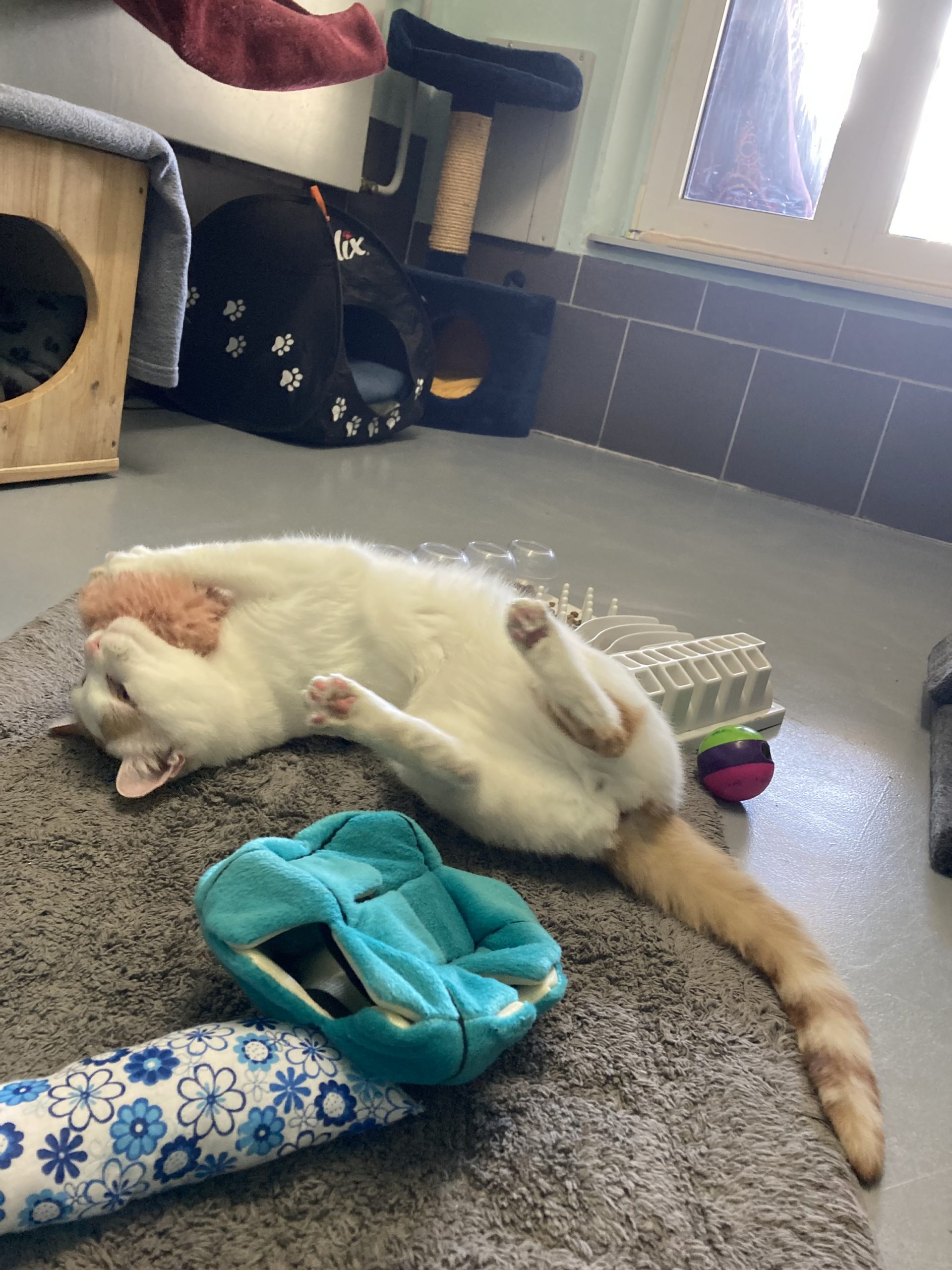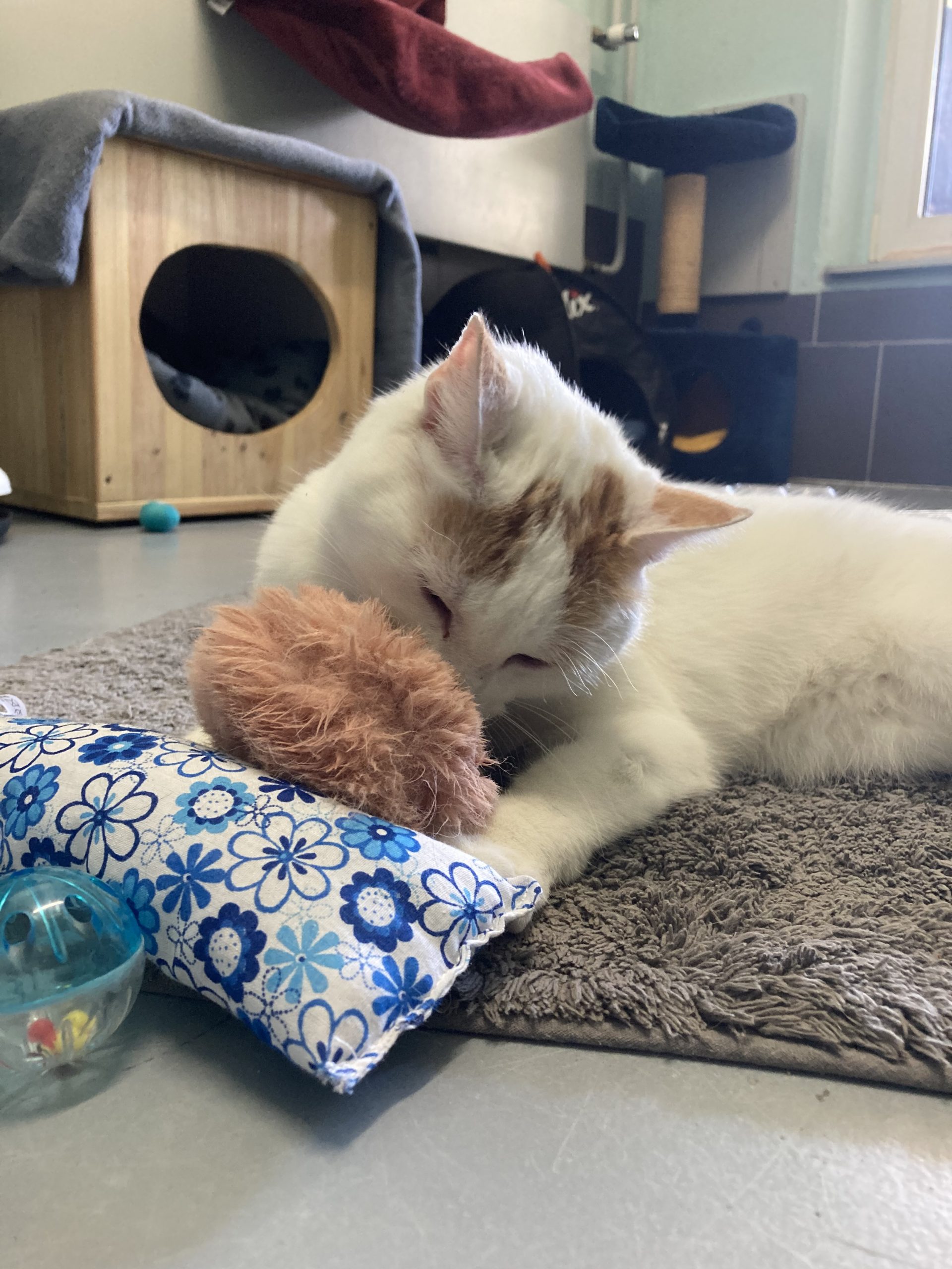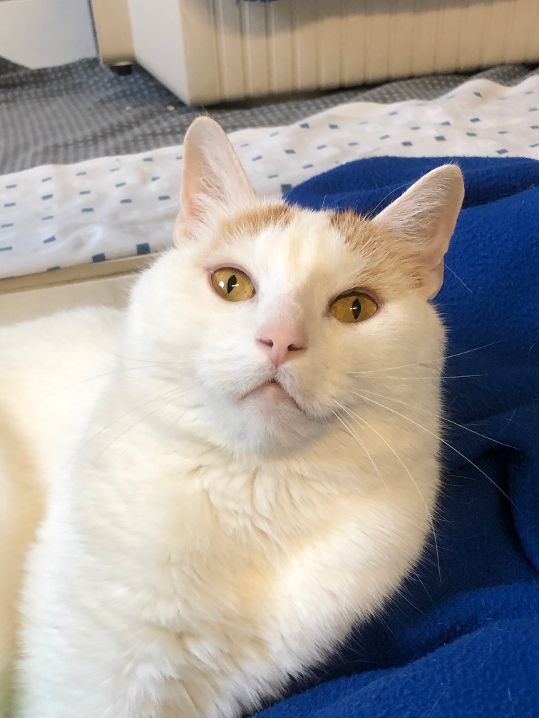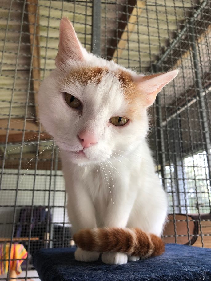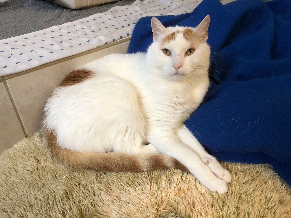 Kater Mojo kam von einem anderen Tierschutzverein zu uns – er hatte auf der Pflegestelle, auf der er lebte, mehrfach Krallen und Zähne gezeigt. Im Tierheim stellten wir bald den Grund für dieses Verhalten fest: Mojo hatte starke Schmerzen, die von einer weit fortgeschrittenen Arthrose herrührten, und schon der Versuch, ihn an diesen Stellen zu berühren, verursachte ihm großen Stress. Dies und die bloße Anwesenheit der anderen Stubentiger setzten ihm derart zu, dass er darauf nur mit Angriff reagieren konnte. Als das erkannt war, bekam der schöne weiß-rot-getigerte Kater (vorübergehend) eine Katzenstube für sich allein und wurde zudem von unserer Tierärztin auf eine geeignete Arthrose-Schmerzmedikation eingestellt. Natürlich ließ sich der geplagte Kater mit den unergründlichen Augen immer noch nicht dort anfassen, wo er Schmerzen verspürte, aber Mojo kam endlich zur Ruhe, konnte sogar bald menschliche Zuwendung genießen und zeigte sich bei ihm besonders vertrauten Personen richtiggehend lieb.