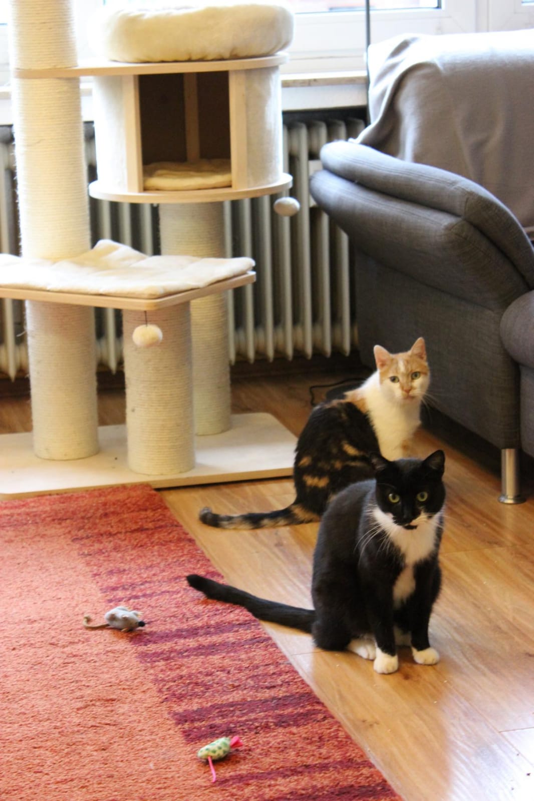 Hier gibt es ganz viel spannende Räume und Dinge zu entdecken. Wir haben einen super schönen großen Kratzbaum, da gibt es Höhlen und tolle Liegeplätze für uns 2.