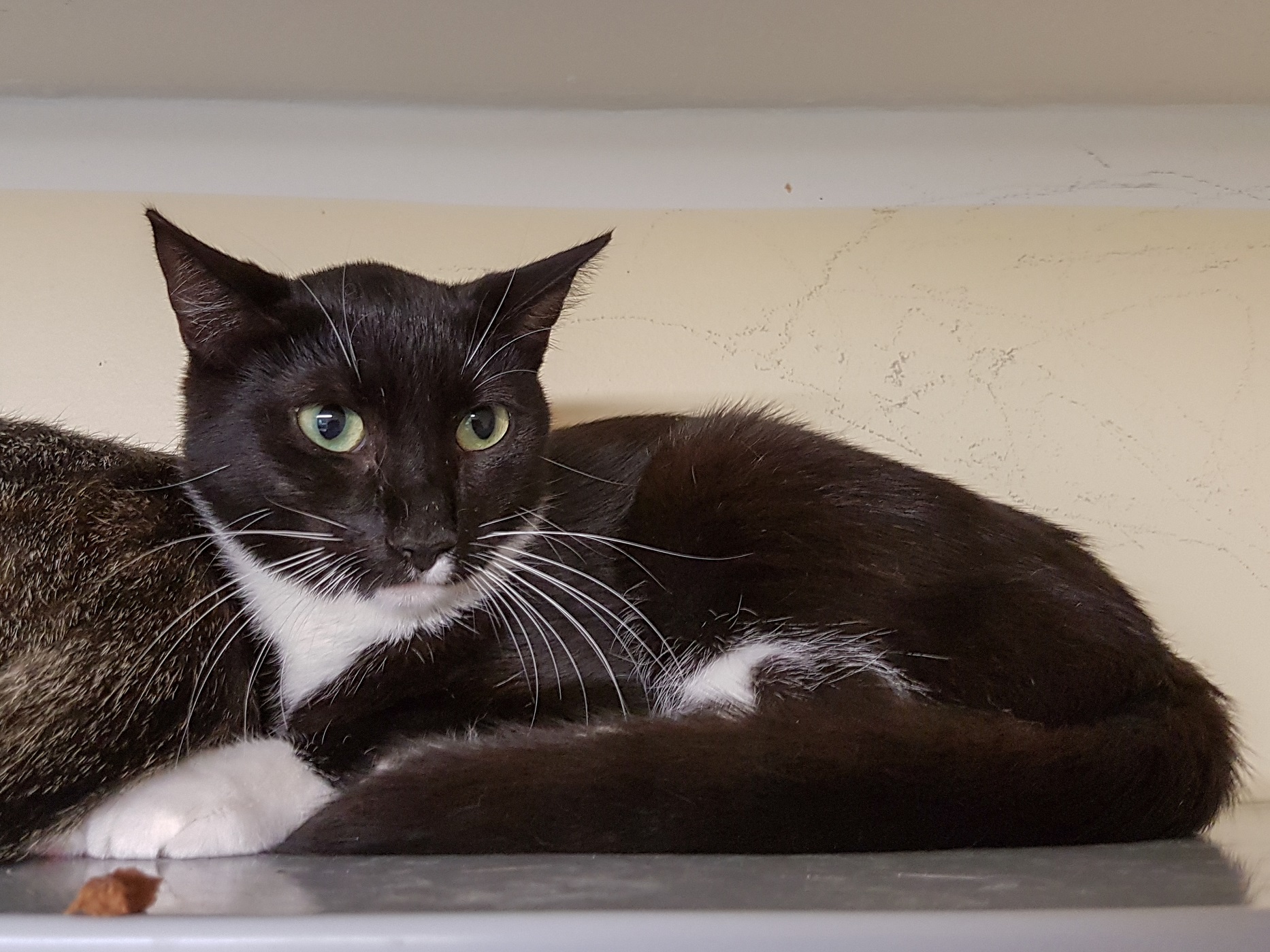 Hier zeigte sich die hübsche schwarz-weiße Samtpfote zunächst sehr scheu und beobachtete das Geschehen in den Katzenstuben um sie herum lieber von einem sicheren Rückzugsort auf einem der oberen Catwalk-Bretter aus.