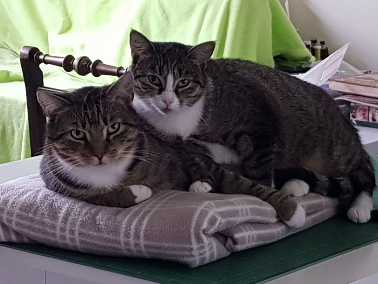 Unters Bett verziehen sie sich auch nur noch selten, meistens liegen sie tagsüber auf meinem Nähtisch auf einer Wolldecke, wie das Foto auch zeigt.