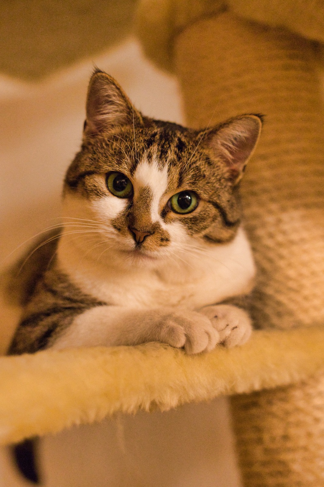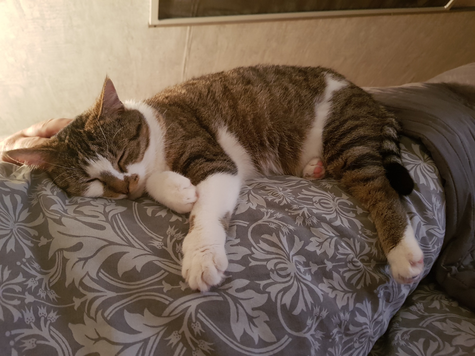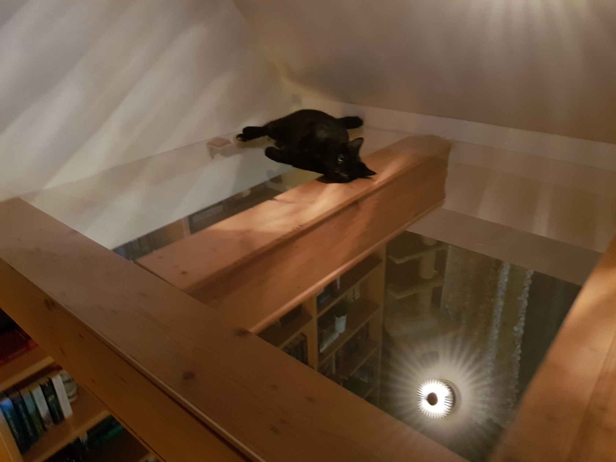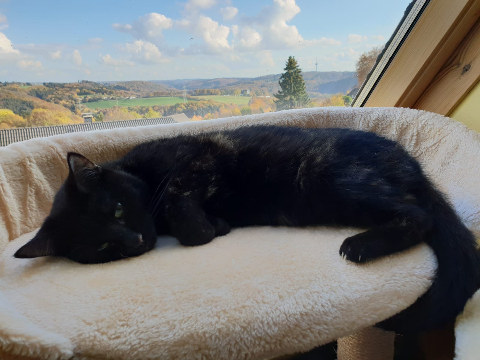 Nach dem Frühstück halte ich erst mal ein kurzes Nickerchen auf den Kleiderschrank (wo ich mittlerweile auch ein kuscheliges Bett habe, damit ich nicht auf dem harten Holz liegen muss), anschliessend geht es auf die Kratzbaumlounge direkt unter dem Dachfenster, da kann ich rausschauen und mich gleichzeitig sonnen.