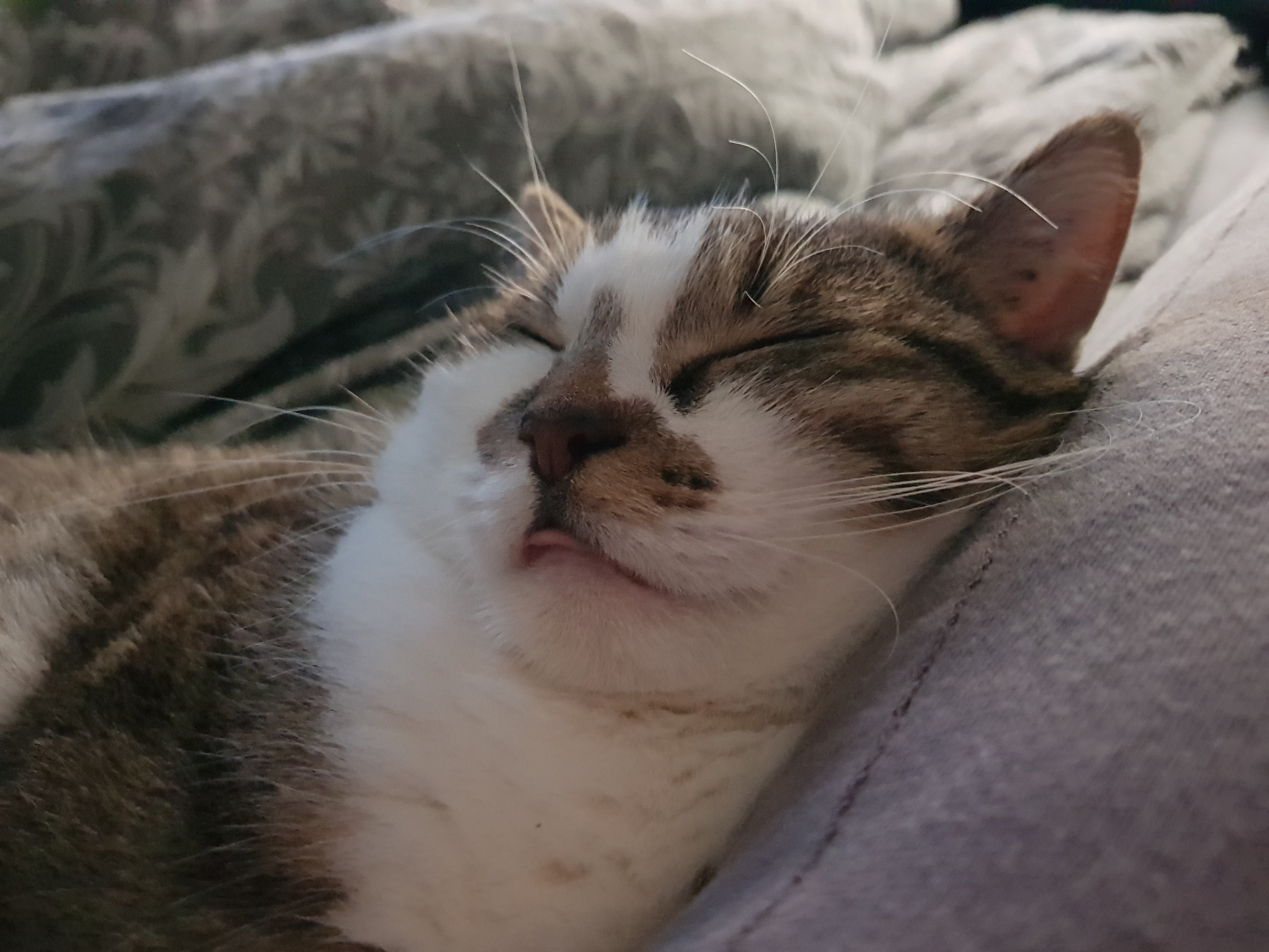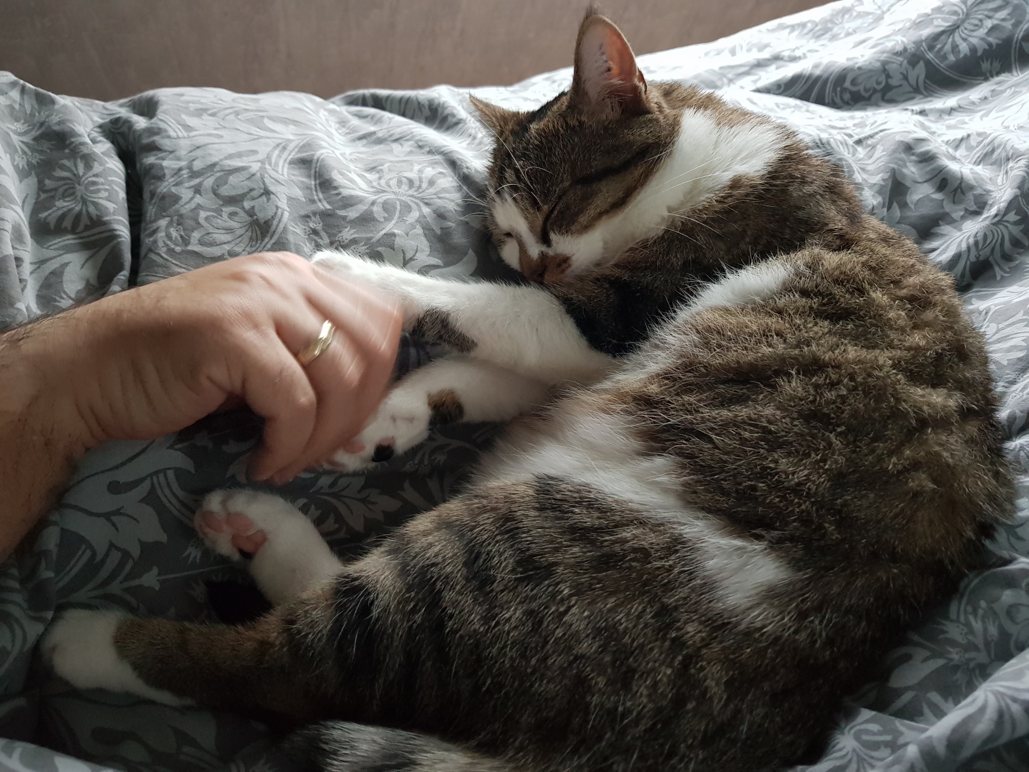 Gipsy versucht eigentlich jede Sekunde mit den Zweibeinern zu verbringen, schläft jede Nacht im Bett und dort entweder zwischen unseren Menschen, oft direkt auf dem Papa!