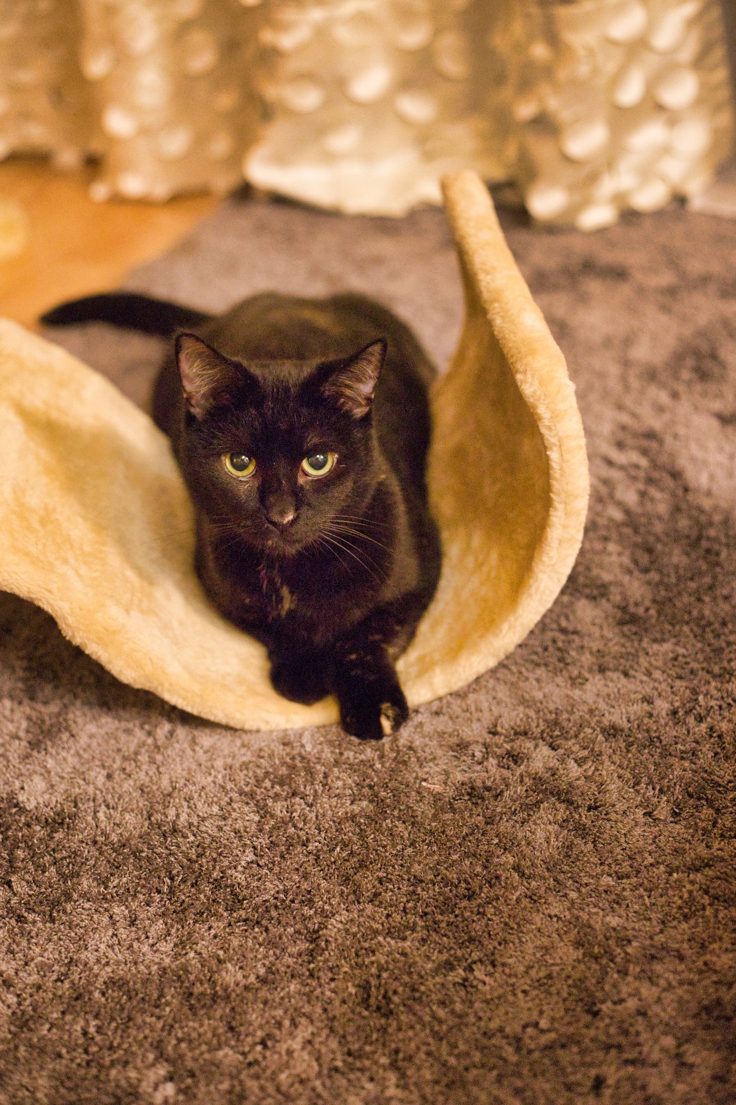 Nachts schlafe ich bei meinen Menschen im Schlafzimmer, da habe ich ein tolles Bettchen direkt neben deren Bett – von dort habe ich es nicht weit, wenn ich eine Schmuseattacke habe – und bei Papa liegt für diese Fälle immer eine kuschelige Decke zum milchtreten und nuckeln bereit.