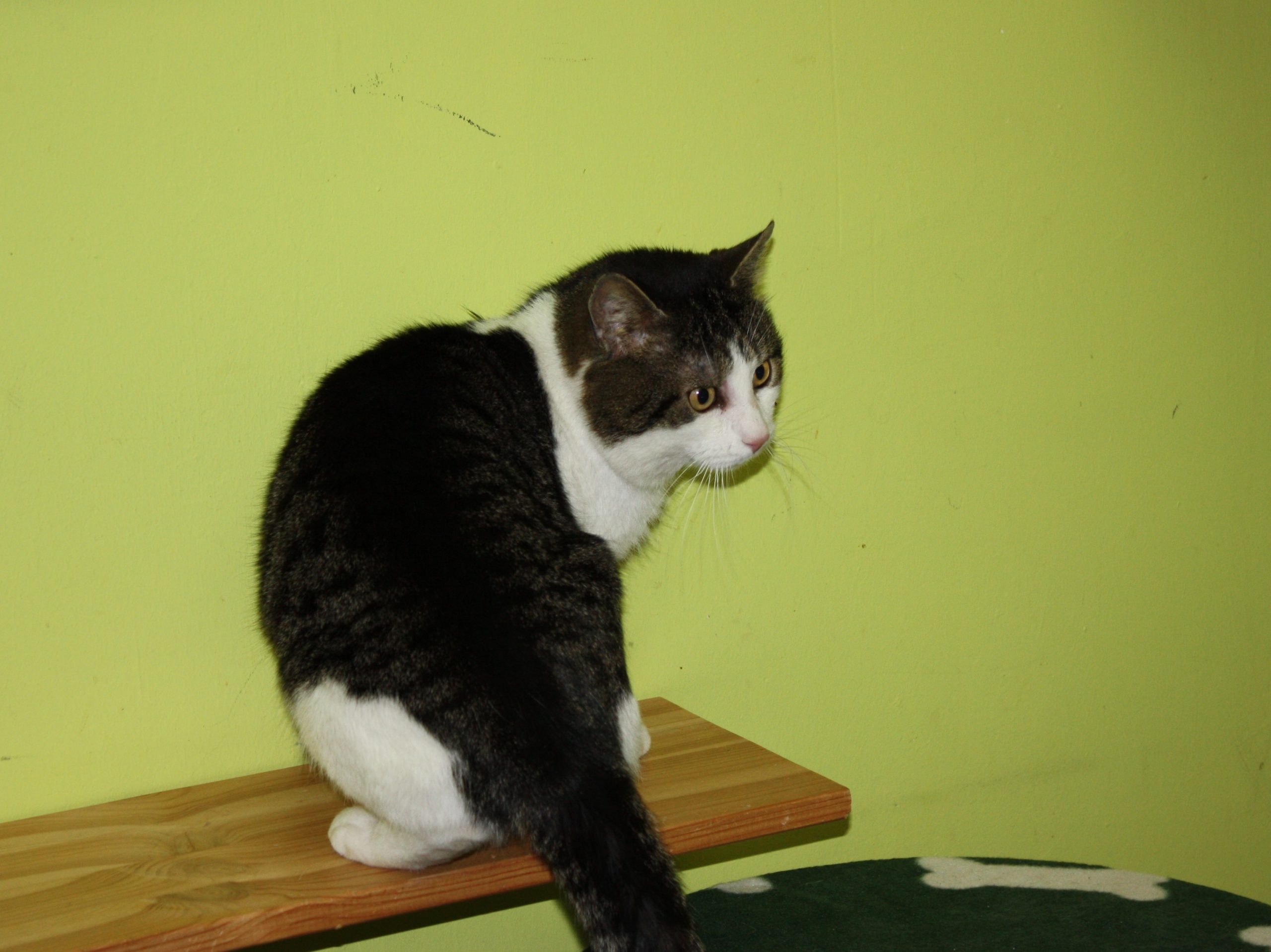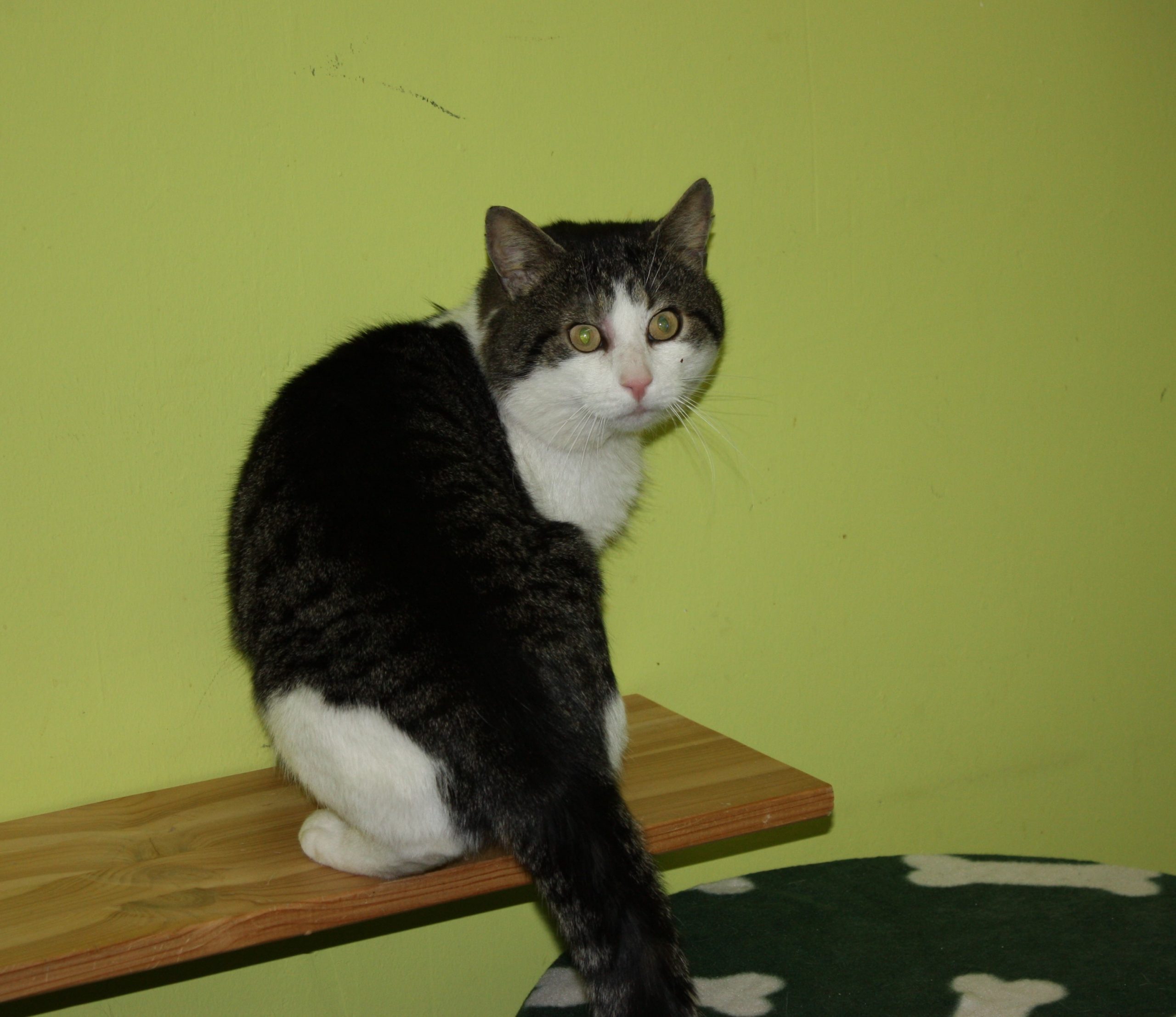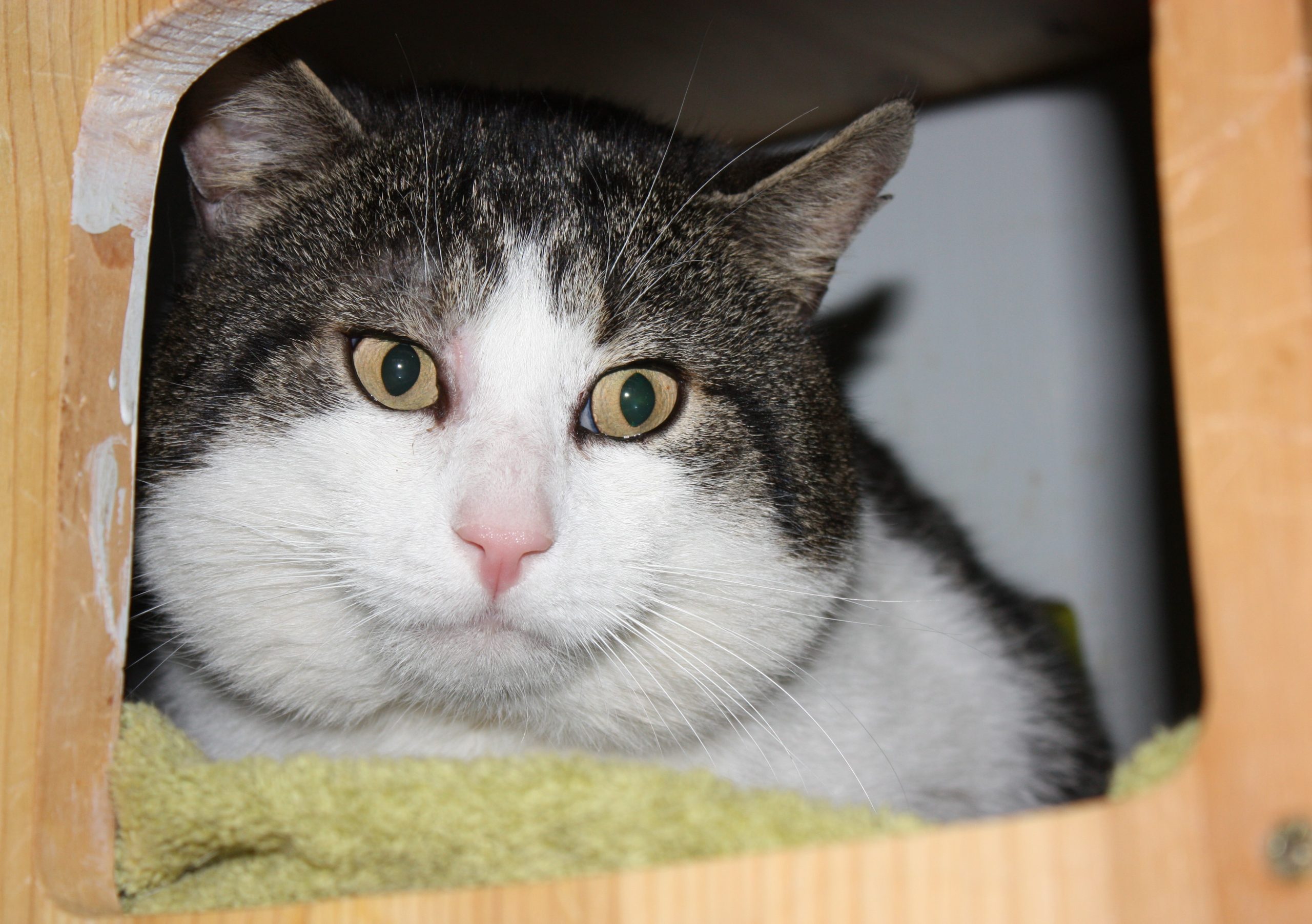 Zu Beginn seines Aufenthaltes bei uns im Tierheim war Simon durch die unbekannte Situation sehr verunsichert und der hübsche, getigert- und weiß-fabene Bursche mit dem prächtigen Katerkopf versteckte sich zunächst schüchtern vor den Blicken seiner Besucher. Doch schon bald war Mitarbeitern wie Ehrenamtlern klar, dass Simon ein ganz großer Schmuser ist.