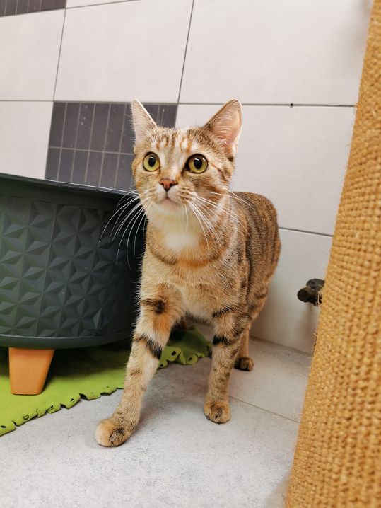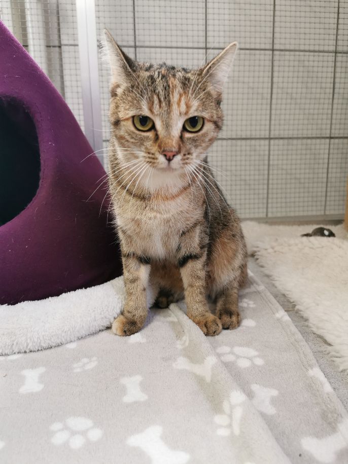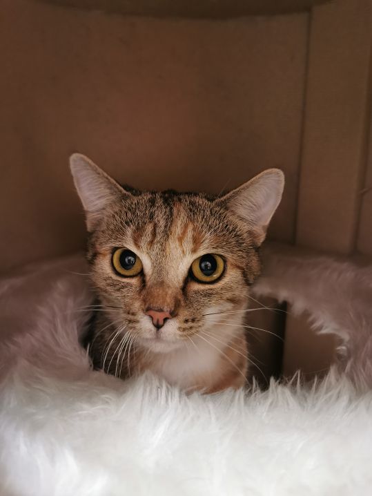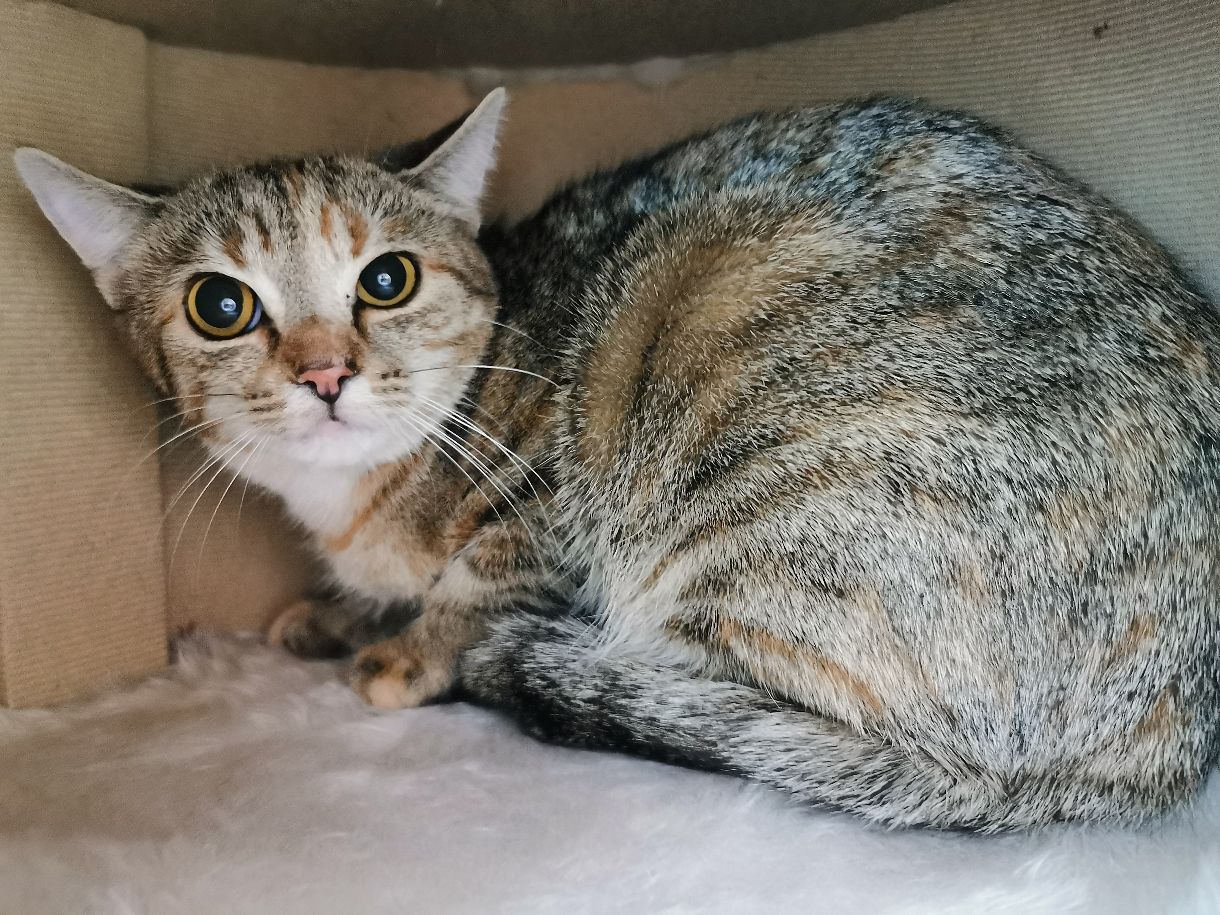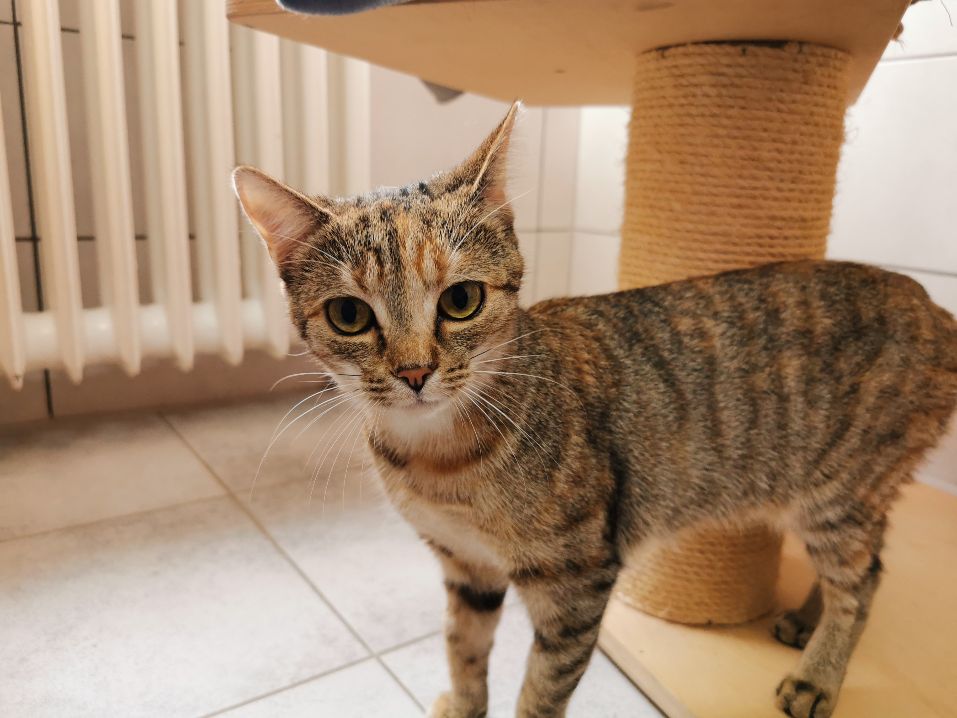 Und so kam das Unglücksfellchen Spirelli wieder zurück ins Tierheim. Jetzt musste sie ja auch noch von ihren Artgenossen isoliert werden, um sie nicht anzustecken, und so saß Spirelli alleine und schüchtern im Tierheim – ihre kleine Welt war aus den Fugen geraten. Aber die kleine getigerte Jungkatze ließ sich so schnell nicht unterkriegen und fasste nach ihrer ersten Verwirrung rasch Vertrauen zu den Menschen. So genoss sie bald die Streicheleinheiten und Zuwendung, die sie von den Zweibeinern bekam, wurde anschmiegsam und verschmust und beschäftigte sich mit viel Geschick mit allerlei Katzenspielzeug. Wenn es dann noch um Leckerchen ging, war das aufgeweckte Katzenmädel für jede Aufgabe zu haben. Alle mochten die kleine Fellnase sehr, aber alle machten sich Gedanken, denn Mitarbeiter und Ehrenamtler wussten, dass eine Vermittlung nicht einfach werden würde. So hofften und bangten wir……