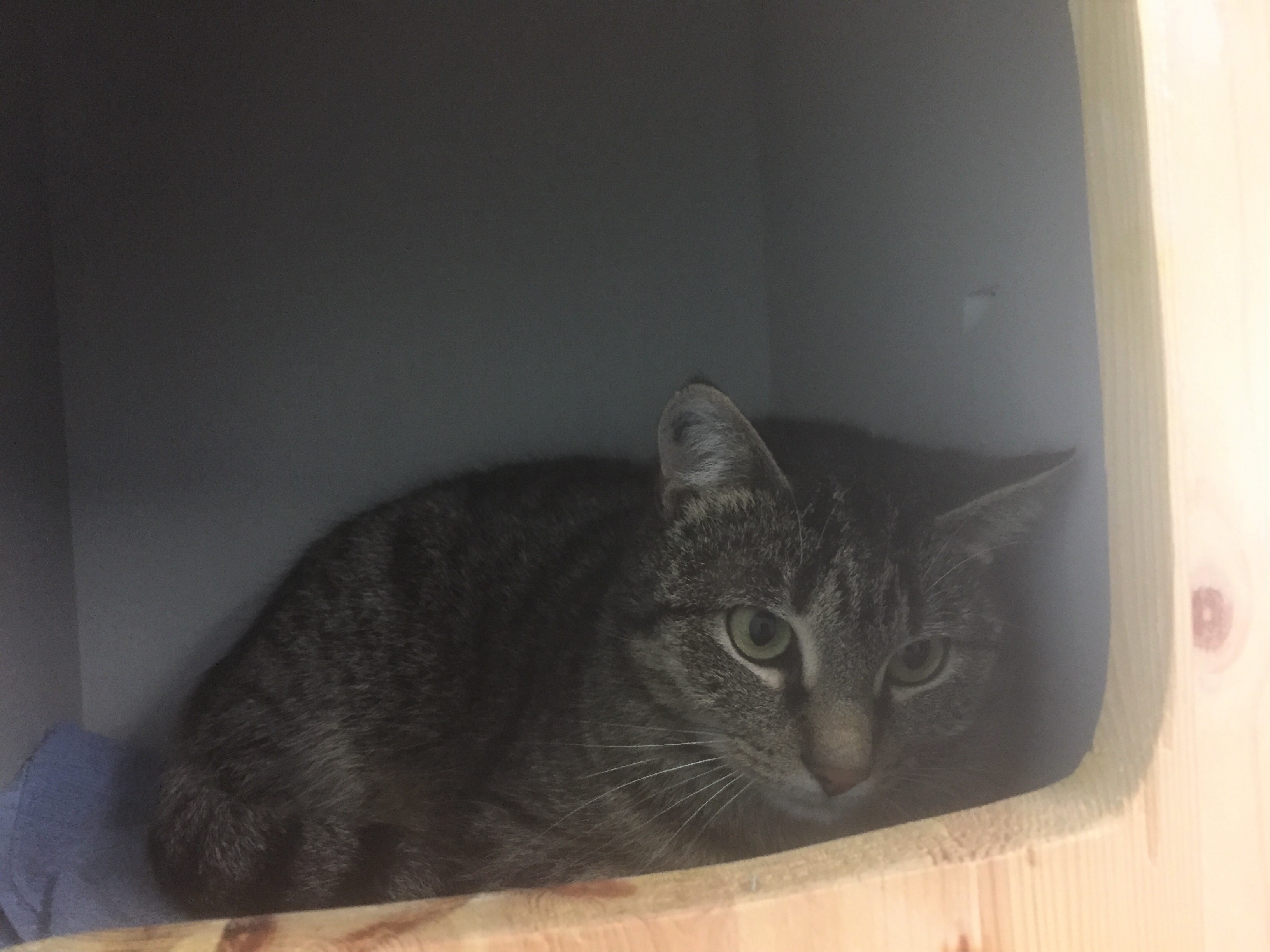 Die zierliche grau getigerte Rosa, die aus einem anderen Tierheim zu uns übersiedelte, zeigte sich in der Katzenstube noch schüchtern aber lieb und sehr verträglich mit ihren Artgenossen.