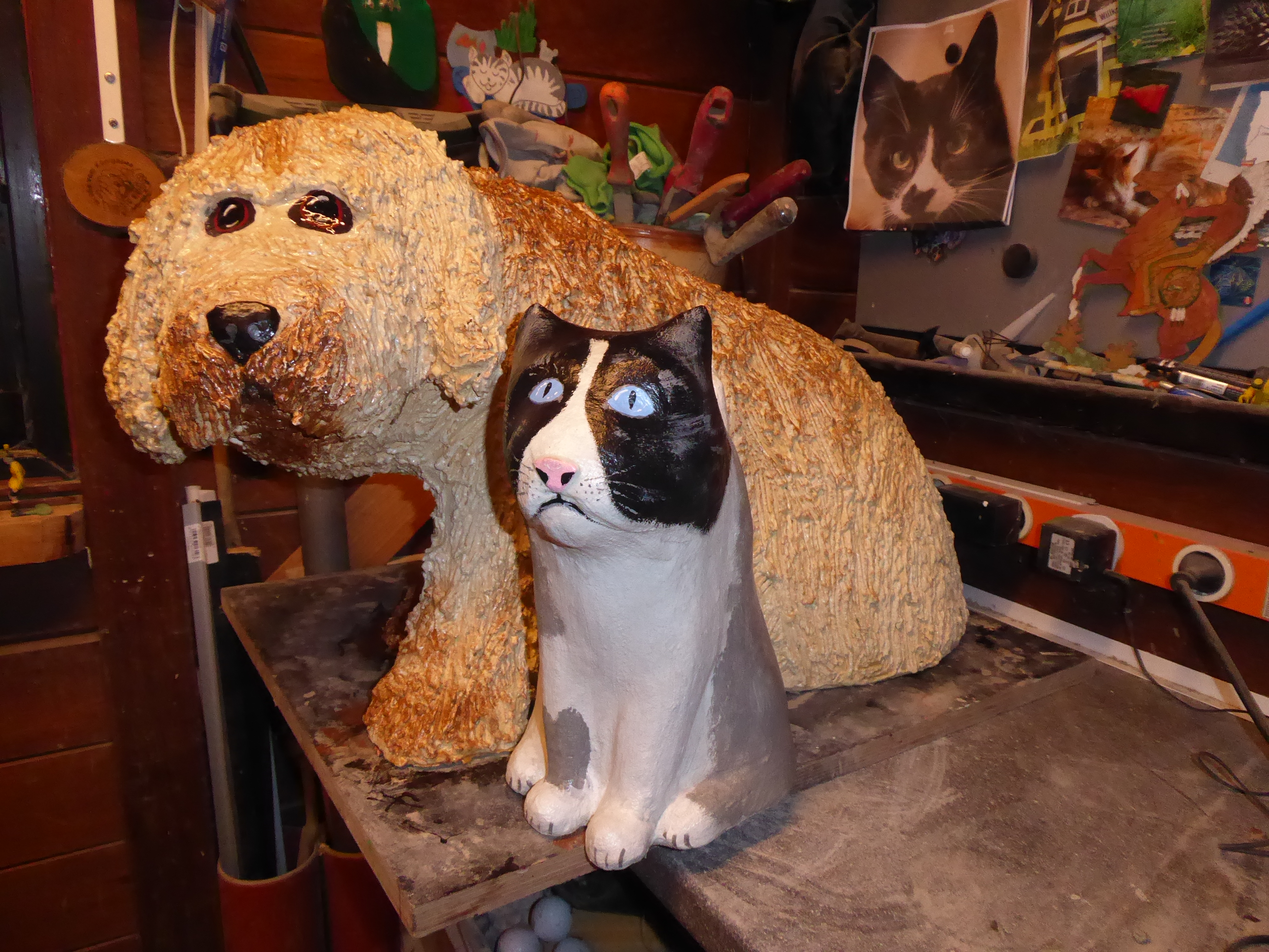 „Mein Freund Christoph erzählte mir, dass er seine gute Freundin Raija in Finnland besuchen wird und ihr eine von meinen Katzen schenken möchte. Ich habe ihm dann eine Exemplar in knallblau mit grünen Punkten gemacht, dass jetzt im Holzhaus an einem See in der Nähe von Lahti in Finnland von einem Baumstumpf aufs Wasser schaut.